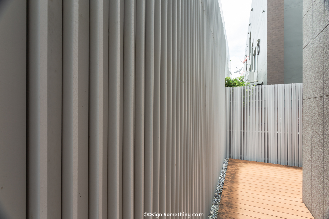 แผ่นหินทางเดินสีดำ เสมือนถูกวางลอยอยู่บนบ่อปลา ทำหน้าที่ต้อนรับผู้อยู่อาศัยและผู้มาเยือนก่อนเข้าถึงประตูด้านในบ้าน ซึ่งในทุกๆครั้งที่เดินผ่านเข้าออกบ้านน้น จะทำให้เกิดประการณ์ รับรู้ถึงการมีอยู่ของบ่อปลานี้มากขึ้น