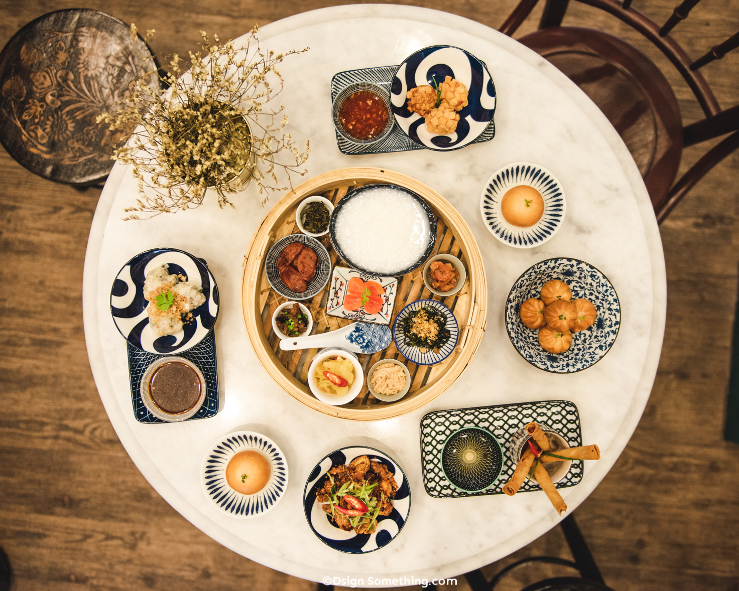 ภาพบรรยากาศในการจัดที่นั่งร้านและตกแต่งร้าน ผู้ออกแบบตั้งใจให้มีกลิ่นอายความเป็นจีนเหมือน‘โรงเตี๊ยม’ ที่มักมีโต๊ะกลมที่ใส่ความโมเดิร์นเข้าไปด้วยลายหินอ่อนสีขาวสะอาด และเก้าอี้เล็กๆ นั่งรวมกันหลายคนเพื่อจิบชากาแฟได้ ทำให้เกิดการปฏิสัมพันธ์ระหว่างลูกค้าที่มามากขึ้น แถมยังเป็นที่สนใจของคนหลายช่วงอายุวัย ตั้งแต่วัยรุ่นจนถึงวัยอากงอาม่า