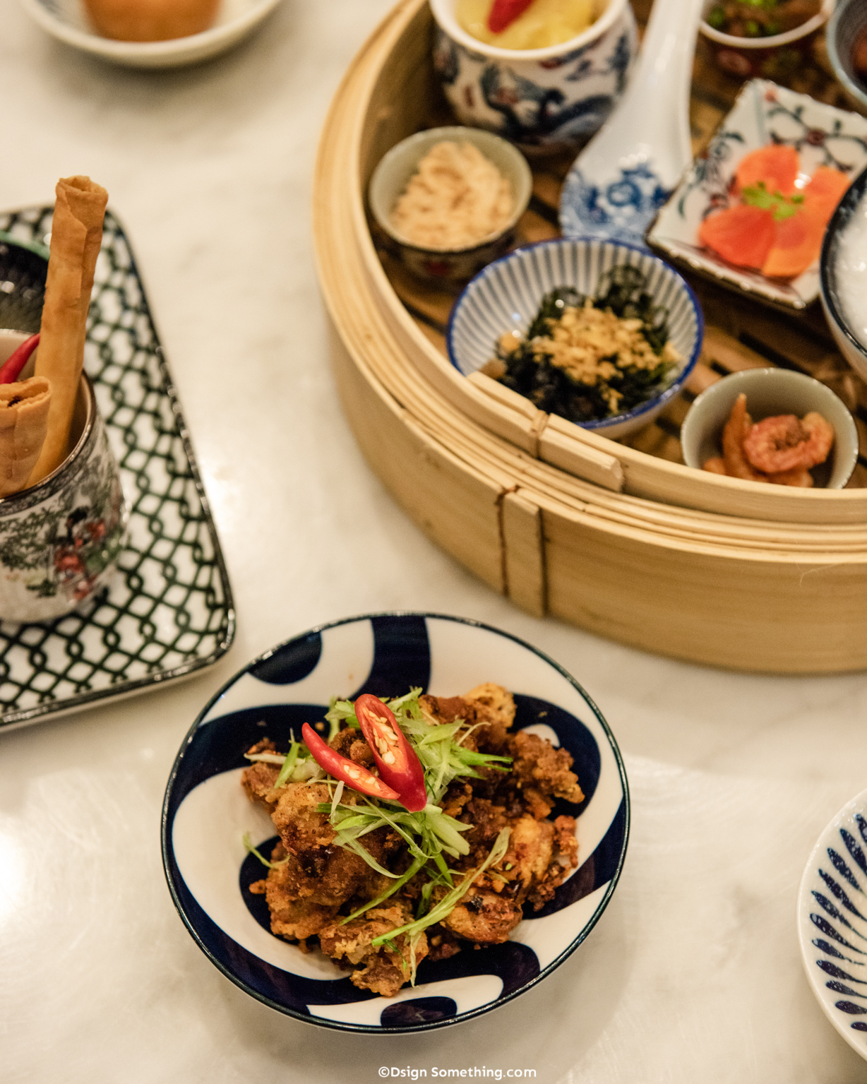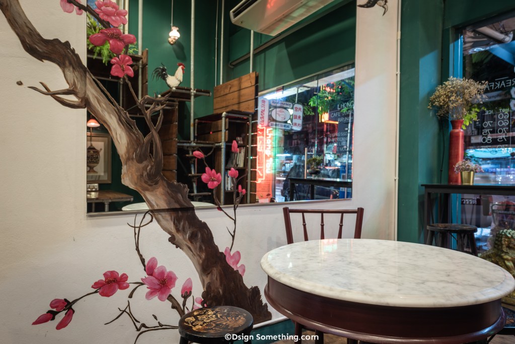 การใส่ความเป็นจีนลงในงานออกแบบตกแต่ง เริ่มต้นตั้งแต่โทนสีหลักอันโดดเด่นของร้านที่ผู้ออกแบบเลือกใช้สีเขียว เพราะถือเป็นสีมงคลของจีนอีกสีหนึ่ง และให้มีความแตกต่างจากเยาวราชที่ส่วนใหญ่เน้นเป็นสีแดง นอกจากนี้จะสังเกตได้ว่ามีภาพวาดบนผนังเป็นรูปสัตว์ต่างๆ เช่น ไก่ กระต่าย นกยูง รวมถึงดอกcherry blossom รูปภายในกรอบรูปอย่าง ถ้วย ชามต่างๆ ซึ่งทั้งหมดล้วนแล้วแต่เป็นสัญลักษณ์มงคลในความเชื่อของคนจีนอีกด้วย