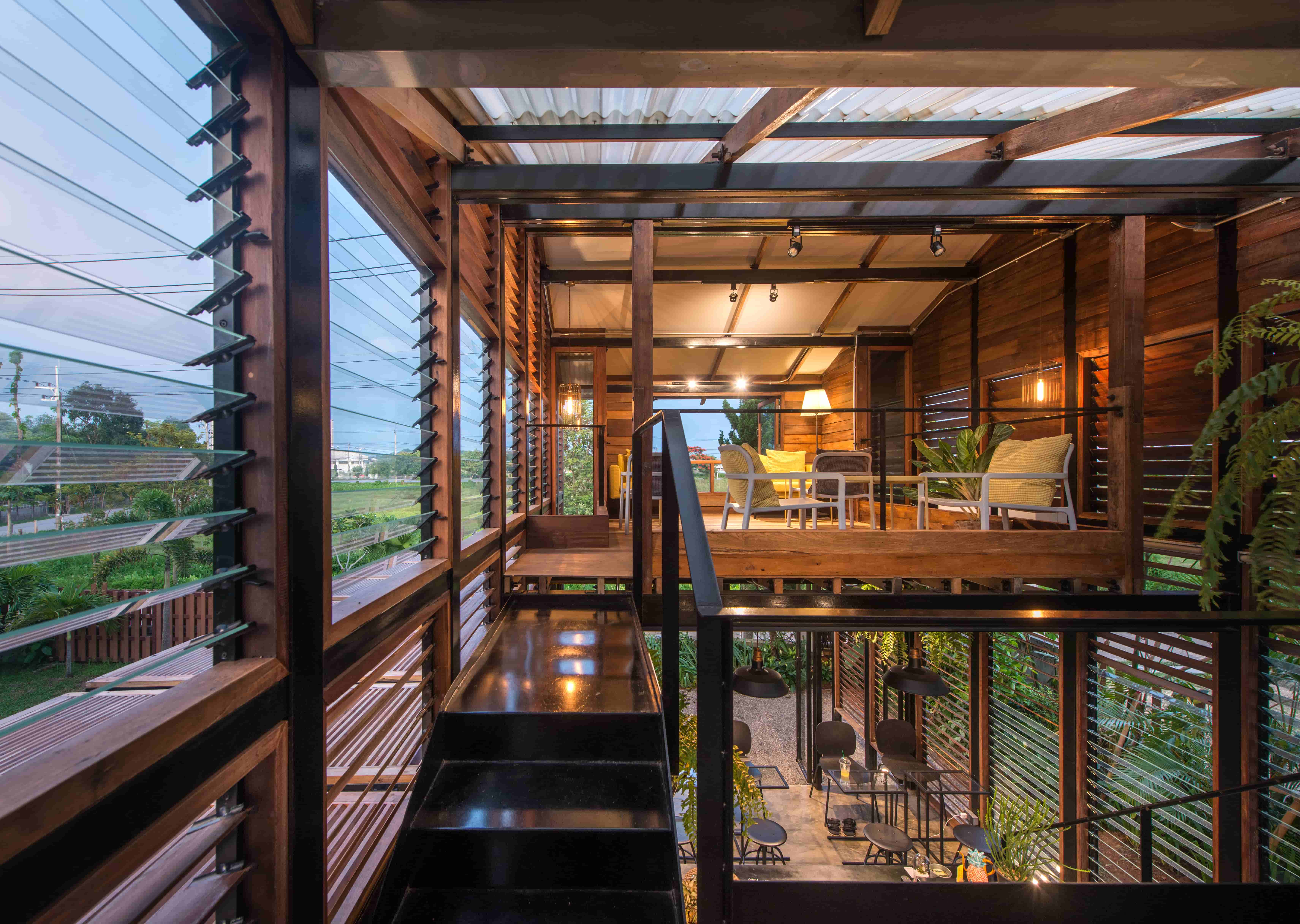 หากสังเกตดีๆ ไม่เพียงแต่มีบานเกล็ดเท่านั้น แต่ยังมีบานเกล็ดกระจกใสแทรกตัวอยู่ด้วยในทิศเหนือของอาคารที่ติดสนามหญ้ากว้าง ซึ่งเป็นมุมมองไปยังธรรมชาติรอบๆ ส่วนในทิศใต้จะเน้นการใช้บานเกล็ดไม้เป็นหลักเพื่อบดบังแสงแดดในตอนกลางวัน แต่ยังมีการใช้บานเกล็ดกระจกใสแทรกไปในแนวเฉียงตามแนวบันได เพื่อเปิดรับแสงสว่าง และวิวทิวทัศน์จากธรรมชาติบ้าง