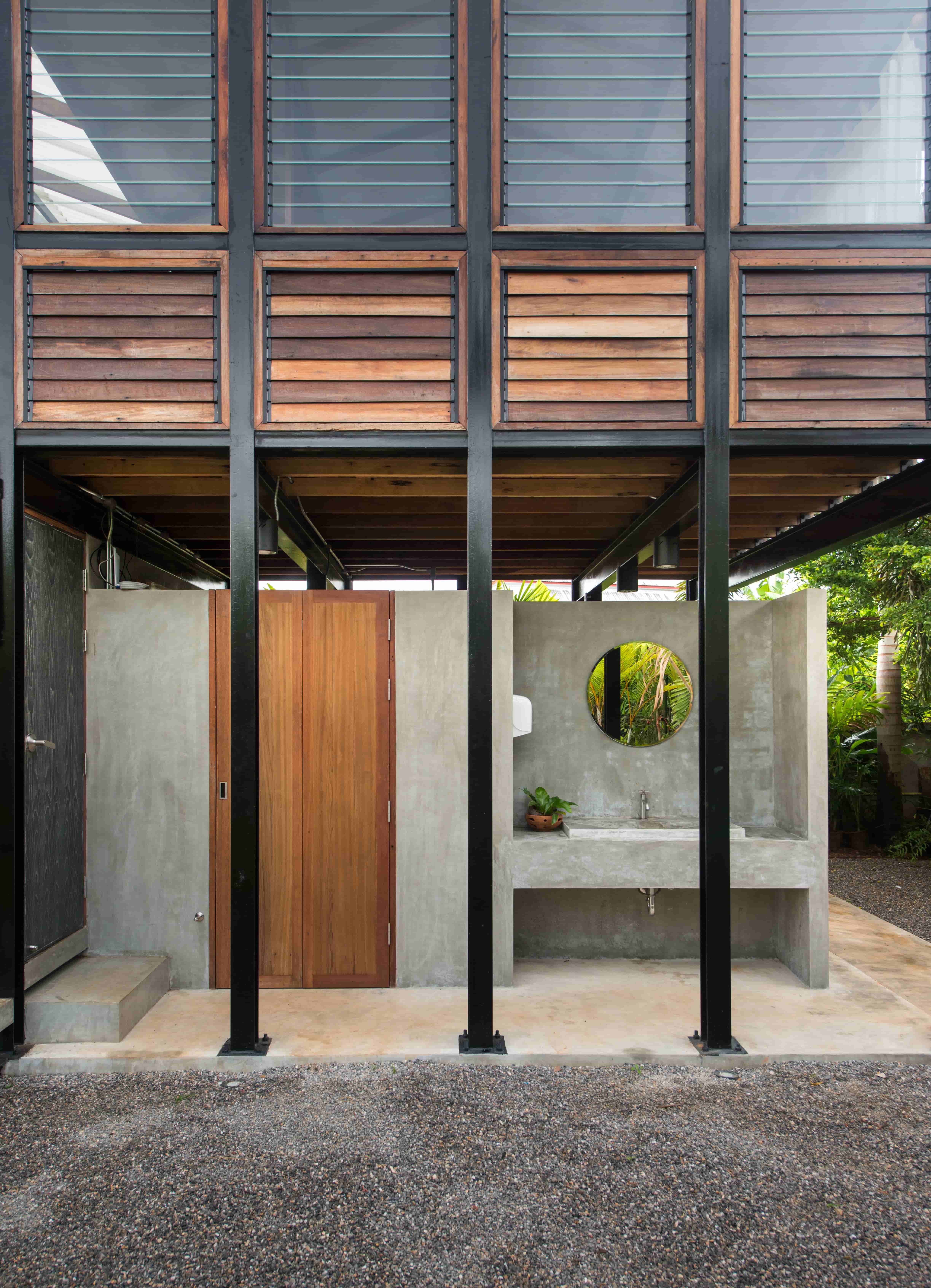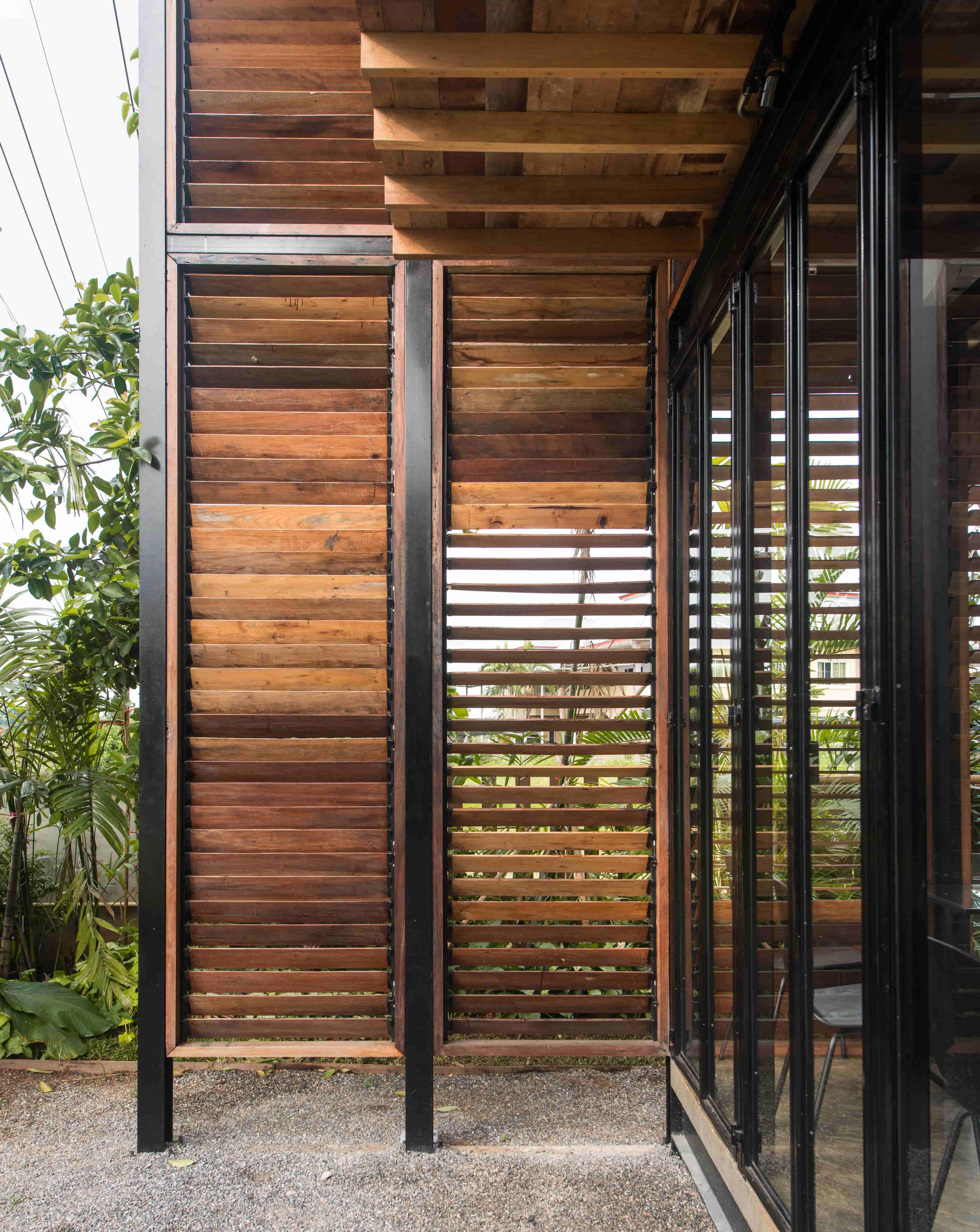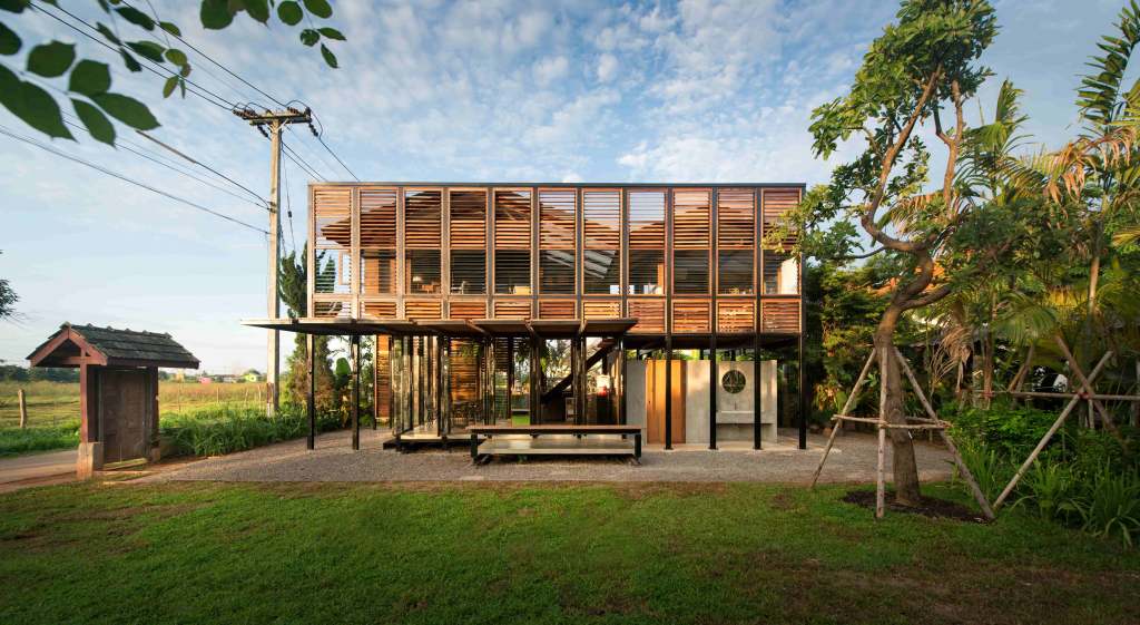 ภาพแรกที่สัมผัสอาคารผ่านสายตา คือ “บานเกล็ดไม้” ซึ่งนำวัสดุพื้นถิ่น เช่น ไม้แดง โดยเลือกไม้เก่าที่เจ้าของมีอยู่เดิมและที่หาเพิ่มเติมจากในชุมชน มาผสมผสานกันด้วยฝีมือของช่างพื้นถิ่นให้กลายเป็นองค์ประกอบหลักของอาคารที่มีคุณค่า ซึ่งนอกจากจะทำหน้าที่ห่อหุ้มเป็นผนังอาคารแล้ว ยังเป็นช่องเปิด-ปิดที่อนุญาตให้ลมและแสงธรรมชาติพัดผ่านเข้าไปยังพื้นที่ภายในได้อย่างเหมาะสม
