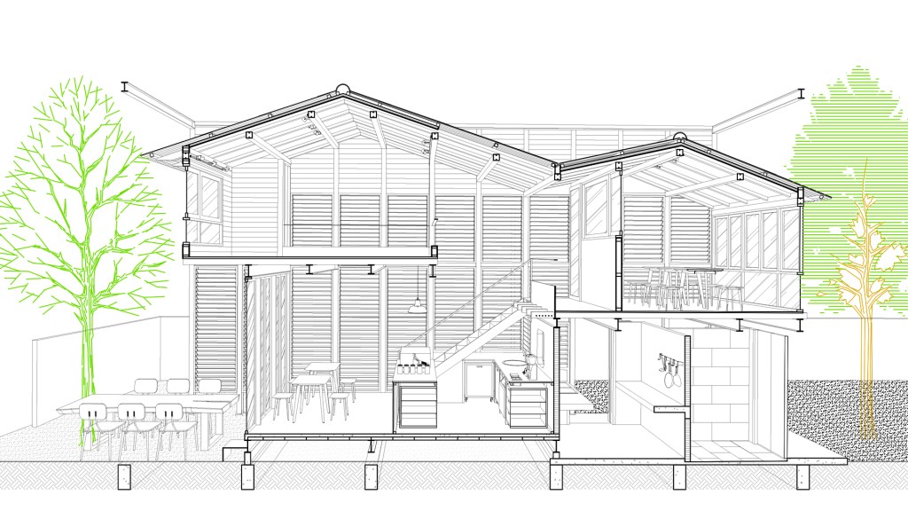 ความลับทางรูปทรงสถาปัตยกรรมที่เผยออกมาให้เห็นเมื่อเปิดบานเกล็ดไม้ทั้งหมดทางทิศเหนือ คือ ภาพของหลังคาจั่วใหญ่และเล็กเชื่อมต่อกันอยู่ รวมถึงพื้นที่ภายในได้อย่างชัดเจน ซึ่งได้แรงบันดาลใจมาจาก “ฝาไหล” องค์ประกอบผนังของบ้านไทย ที่เป็นผนังเวลาปิด และเป็นช่องหน้าต่าง เพียงแต่แทนที่เป็นบานเกล็ดเเพราะเปิดปิดได้ง่าย และเมื่อเปิด ก็เผยให้เห็นรูปลักษณ์ภายในอาคารที่เป็นหลังคาจั่วแสดงถึงรูปทรงของสถาปัตยกรรมไทยที่ทุกคนเข้าใจได้ ภูมิปัญญา และความกลมกลืนกับบริบทรอบข้างอย่างแนบเนียน