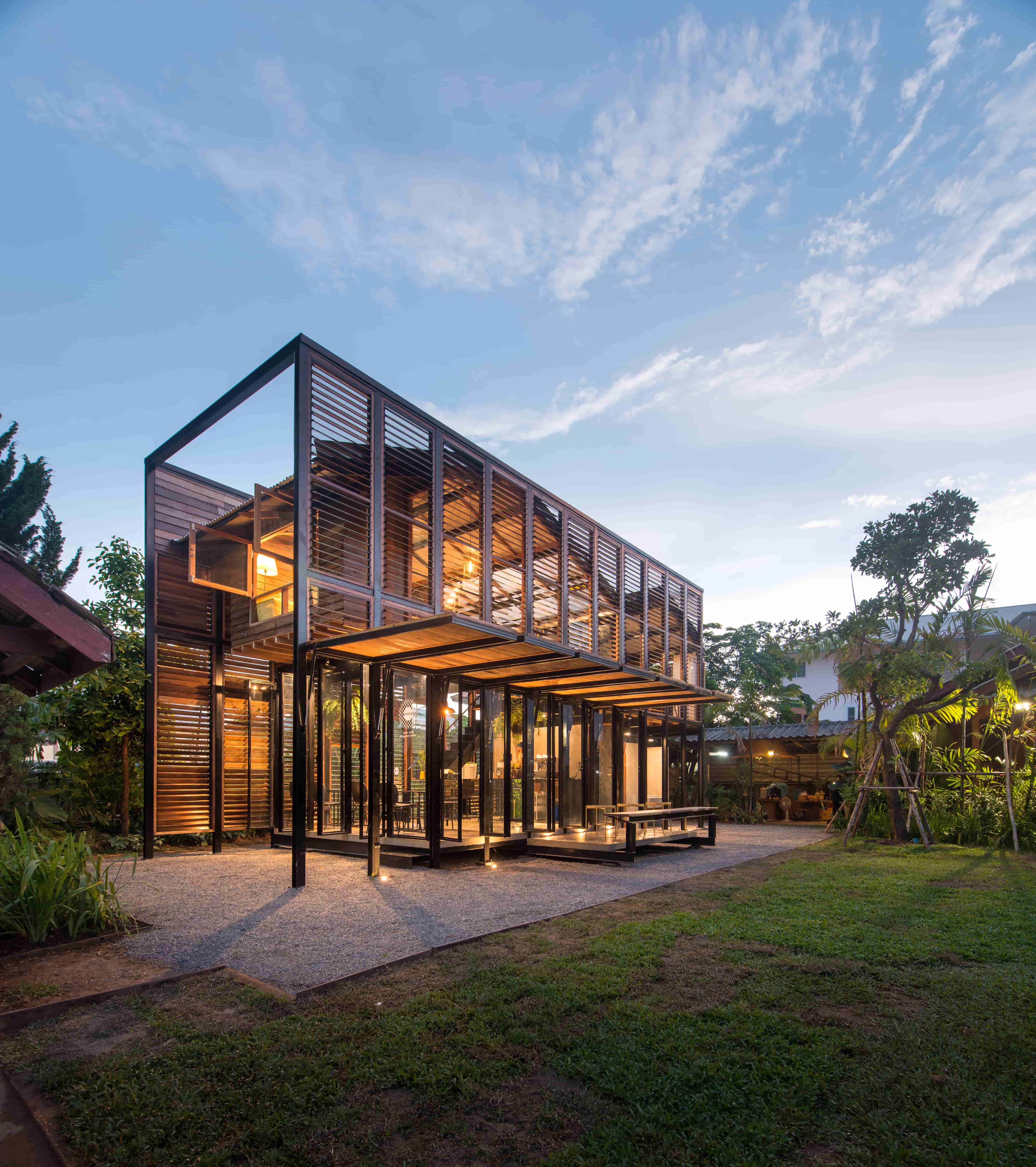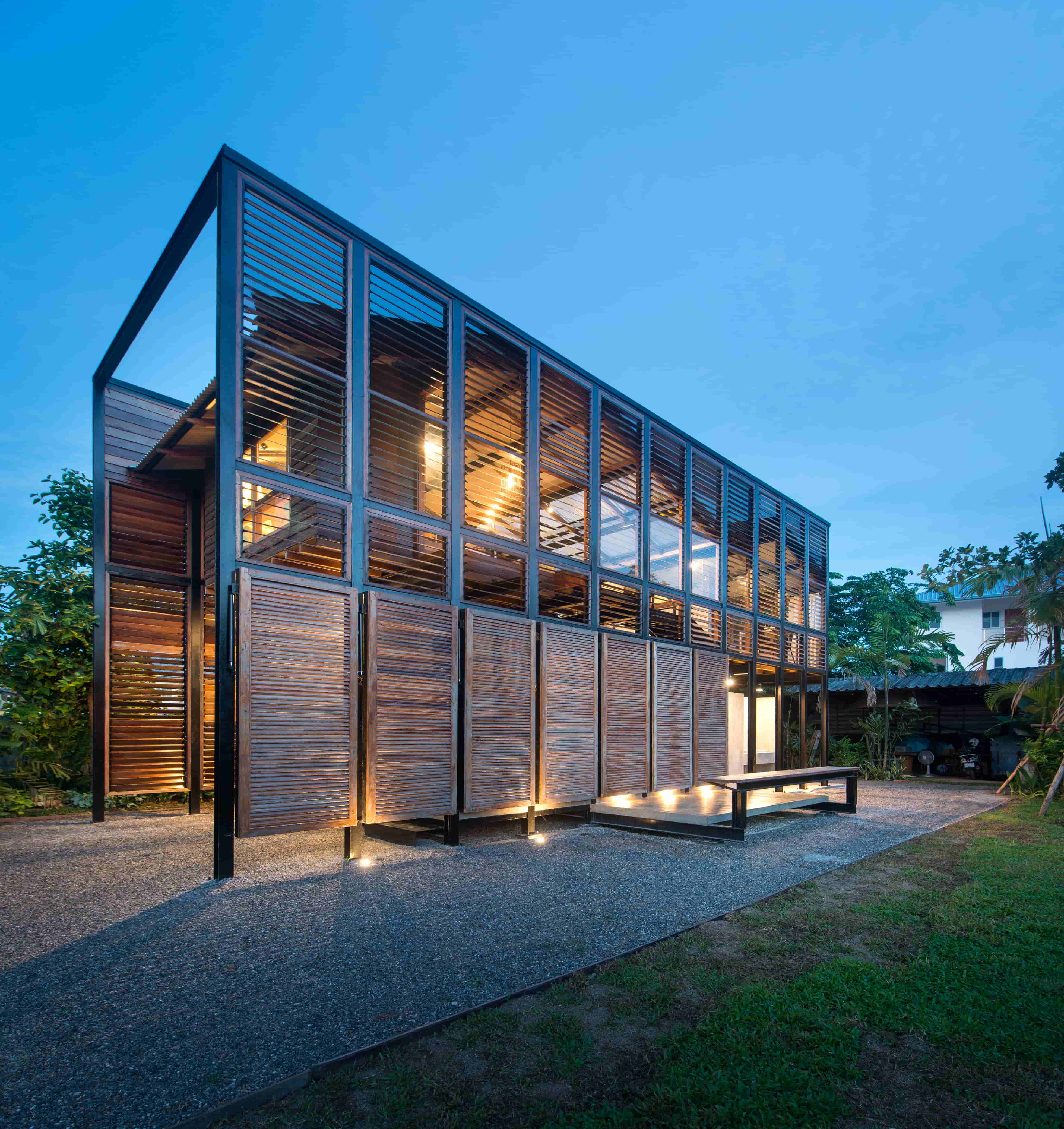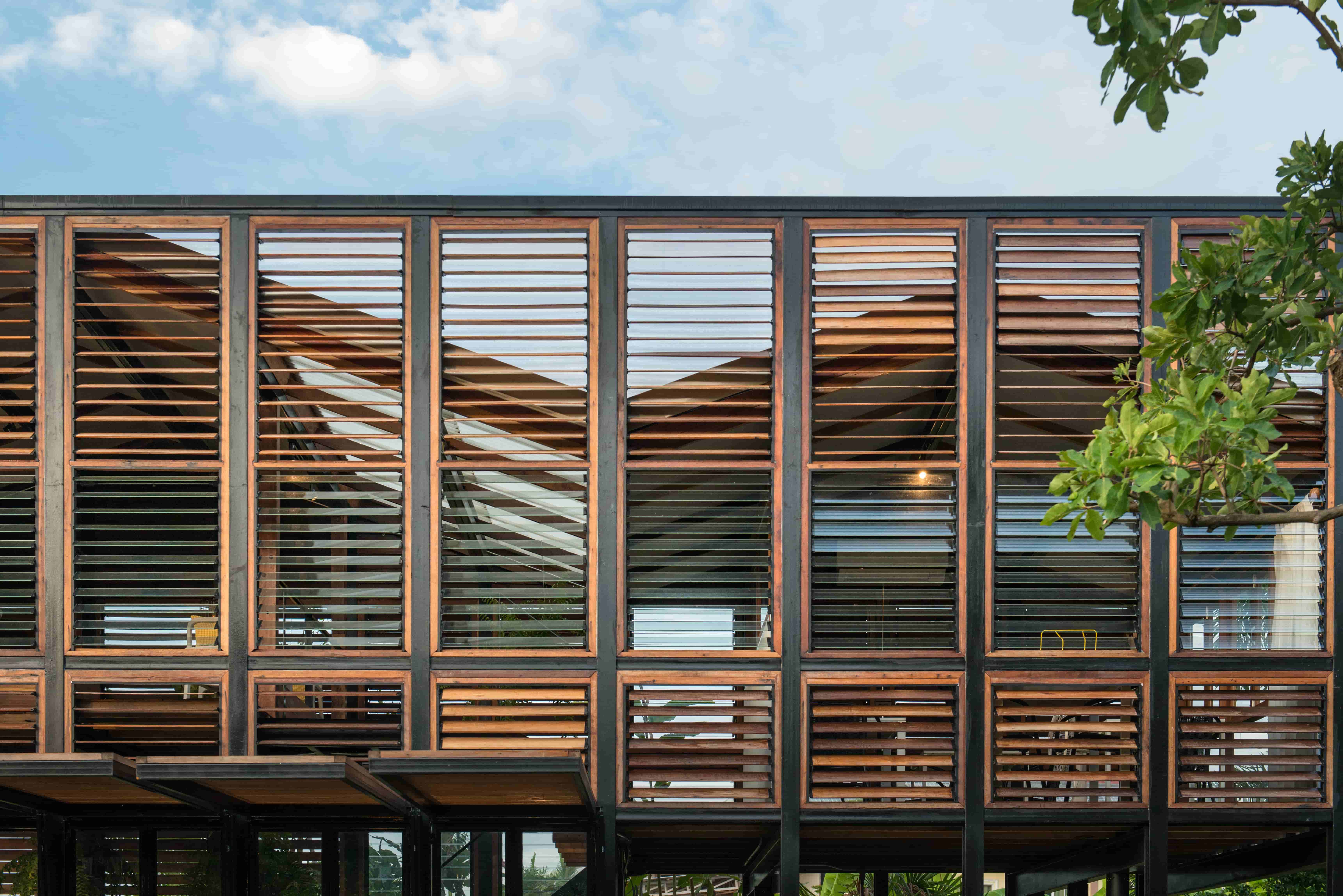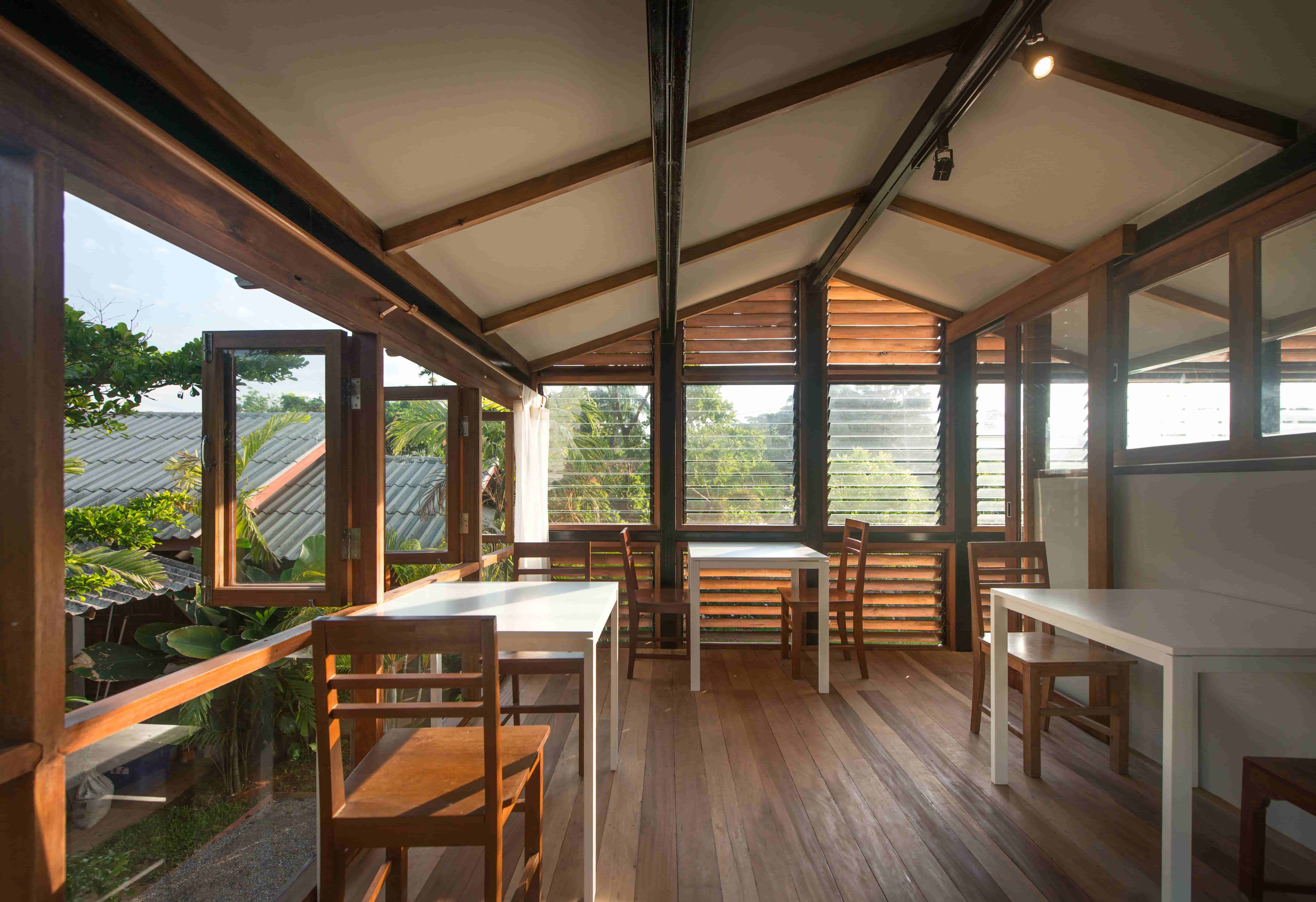 ภาพแรกที่สัมผัสอาคารผ่านสายตา คือ “บานเกล็ดไม้” ซึ่งนำวัสดุพื้นถิ่น เช่น ไม้แดง โดยเลือกไม้เก่าที่เจ้าของมีอยู่เดิมและที่หาเพิ่มเติมจากในชุมชน มาผสมผสานกันด้วยฝีมือของช่างพื้นถิ่นให้กลายเป็นองค์ประกอบหลักของอาคารที่มีคุณค่า ซึ่งนอกจากจะทำหน้าที่ห่อหุ้มเป็นผนังอาคารแล้ว ยังเป็นช่องเปิด-ปิดที่อนุญาตให้ลมและแสงธรรมชาติพัดผ่านเข้าไปยังพื้นที่ภายในได้อย่างเหมาะสม