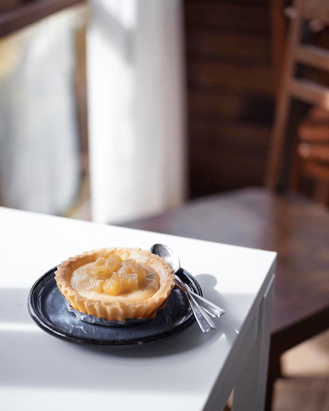 เมนูขนมขายดีของร้านป่าซาง ด้านบนเป็นเนื้อสับปะรดภูแล และเนื้อเค้กเข้มข้นพร้อมทาร์ตกรุบกรอบ ที่รสชาติหวานกำลังดี