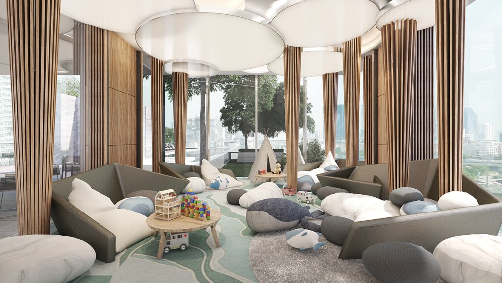 สิ่งสำคัญในการออกแบบ KIDS ROOM นอกเหนือจากความปลอดภัย คือ การเลือกใช้ธีมสีและจัดวางเฟอร์นิเจอร์ โดยเน้นสีสันสดใสเพื่อกระตุ้นจินตนาการ หรือเลือกของเล่นมีเท็กเจอร์ผิวสัมผัสเพื่อให้เกิดการเรียนรู้ ตกแต่งเสาด้วยการนำไม้ระแนงมากรุหุ้มโดยรอบ เพราะสีน้ำตาลจากไม้จะช่วยสร้างบรรยากาศอบอุ่น เสริมกับการทำฝ้าเพดานหลายระดับ แล้วซ่อนไฟไว้บนฝ้าประดับ ลดการใช้ไดเร็คไลท์และเลือกใช้แสงธรรมชาติจากช่องเปิดรอบทิศทางแทน