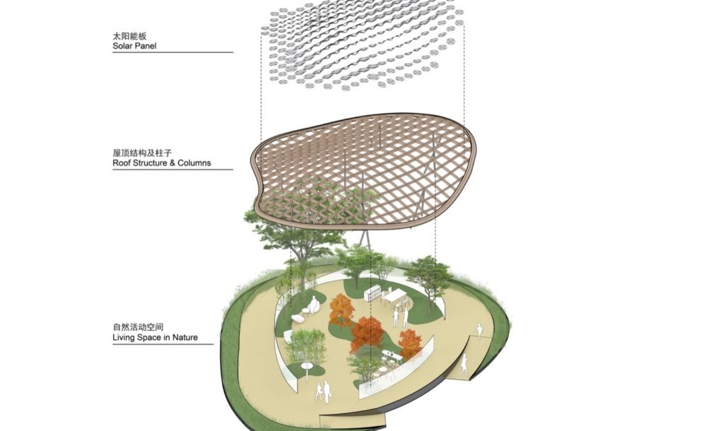 โครงสร้างของพาวิเลียนนี้ประกอบไปด้วย 3 ส่วนหลักๆ ได้แก่ พื้นที่อยู่อาศัย หลังคาไม้โครงกริด และแผงโซลาร์เซลล์ที่เปิดรับพลังงานจากแสงอาทิตย์ โดยโครงสร้างหลังคาไม้แบบกริดรูปแบบฟรีฟอร์ม มีช่องเล็กๆที่สอดแทรกชั้นกระจกโปร่งแสง ช่วยปกป้องพื้นที่ภายในจากฝน ช่วยระบายอากาศตามธรรมชาติ และช่วยให้แสงแดดสาดส่องเข้ามาภายในได้ โดยติดตั้งแผงโซลาเซลล์เล็กๆ ปกคลุมลงไปด้านบน ซึ่งเป็นต้นแบบในการอยู่อาศัยที่นำส่วนหนึ่งของธรรมชาติมาเป็นพลังงานใช้ในชีวิตประจำวันได้จริง