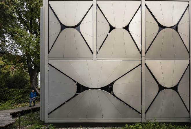 มองเผินๆบานพับทั้งในแนวตั้งและแนวนอนเหล่านี้ เหมือนมีลักษณะและการใช้งานไม่ต่างกัน ปิด-เปิดเพื่อเชื่อมต่อกับธรรมชาติ และควบคุมระดับความเป็นส่วนตัว แต่ความจริงแล้ว สถาปนิกได้ใส่ความพิเศษลงไปให้บานหน้าต่างในแนวตั้ง สามารถแปรเปลี่ยนเป็นระเบียง และหลังคาที่ช่วยบดบังแสงแดดในทิศทางที่แตกต่างในช่วงเวลาของแต่ละวัน และประหยัดเนื้อที่ใช้สอย โดยแบ่งการใช้งานออกเป็น 4 ประเภทด้วยกัน โดยทั้งหมดถูกติดตั้งแบบระบบกลไกลไฮดรอลิก ได้แก่