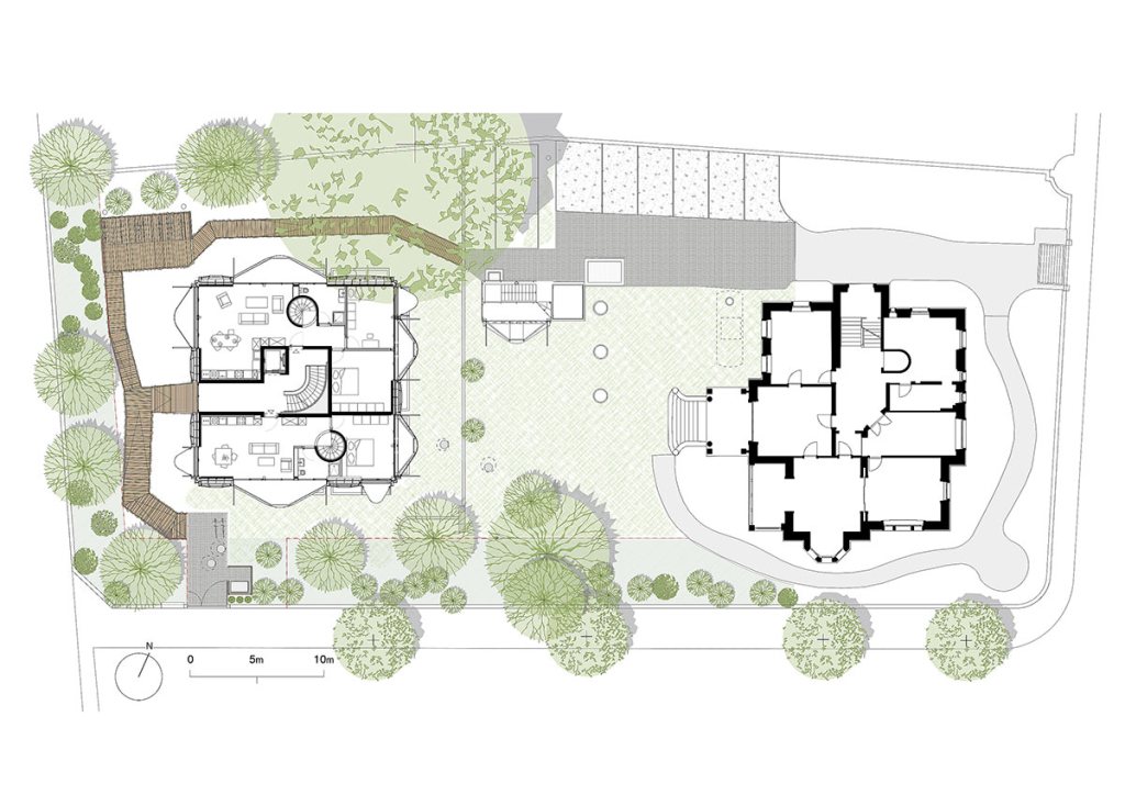 แปลนบ้านชั้นแรกและบริบท ที่แสดงให้เห็นถึงการเชื่อมต่อทางเดินระเบียงไม้เข้าสู่บ้านในทิศตะวันตก