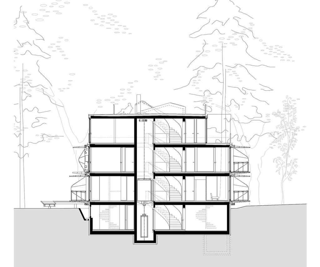 ดูภายนอกเหมือนบ้านหลังนี้จะมี 3 ชั้น แต่ทว่าจริงๆแล้วพื้นที่ภายในมีทั้งหมด 4 ชั้น รวมชั้นใต้ดินที่เป็นที่จัดเก็บระบบเซอวิสและห้องเครื่องต่างๆด้วย ส่วนห้องพักจะแบ่งได้ทั้งหมด 5 ห้อง เปิดเป็นอาพาร์ทเมนท์สำหรับอยู่อาศัย โดยมีบันไดและลิฟท์ ซึ่งเป็นผนังรับน้ำหนักอยู่ส่วนกลางของบ้าน และมีดาดฟ้าหลังคา ที่สามารถเข้าถึงได้ถูกใช้เป็นพื้นที่สำหรับงานศิลปะ