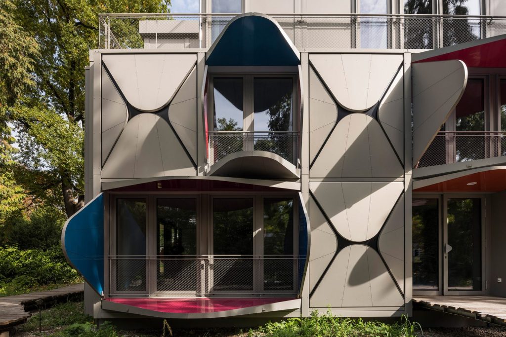 ภาพบ้าน Ballet Mécanique ที่ตั้งอยู่ในย่านชานเมืองของเมืองซูริค ประเทศสวิสเซอร์แลนด์ ดินแดนแห่งยอดเขาสูงที่หลายคนใฝ่ฝันอยากไปสักครั้ง ด้วยการเคลื่อนไหวของ Façade ในลักษณะที่คล้ายกับหน้าต่าง สามารถเปิด-ปิดได้ทั้ง 4 ทิศทาง พร้อมทั้งเผยโทนสีแดงและสีน้ำเงินสลับกันไปตัดกับสีเขียวของธรรมชาติโดยรอบ ทำให้เราสัมผัสได้ถึงความสนุกสนานท่ามกลางบรรยากาศที่เงียบขรึม