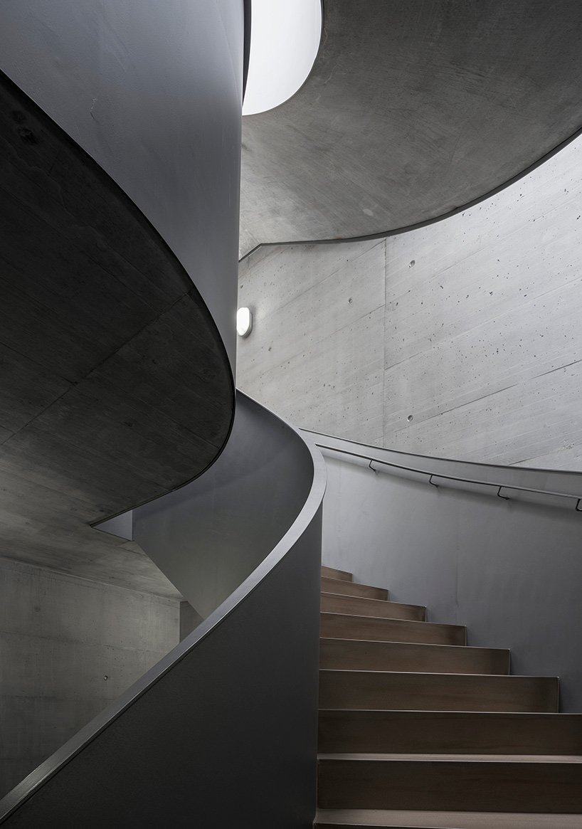 บ้านหลังนี้มีโครงสร้างคอนกรีตเสริมเหล็ก ภายนอกเป็นวัสดุอลูมิเนียมสีไข่มุก ส่วนภายในบ้าน ผนังรับน้ำหนักและเพดานมีพื้นผิวคอนกรีตที่สอดคล้องกับธรรมชาติ ราวระเบียงราวบันไดหน้าต่างบานเกล็ดใช้โครงเหล็กที่มีความโค้งละมุน เข้าคู่กับกรอบบานประตูและหน้าต่างที่ทำจากโพลีโพรพิลีนอลูมิเนียม ภายใต้สัจจะจริงของวัสดุที่เผยออกมานี้ ทำให้เราเห็นความแตกต่างของสีโทนแดงและน้ำเงินที่อยู่ภายในของบานพับได้อย่างชัดเจนมากขึ้น