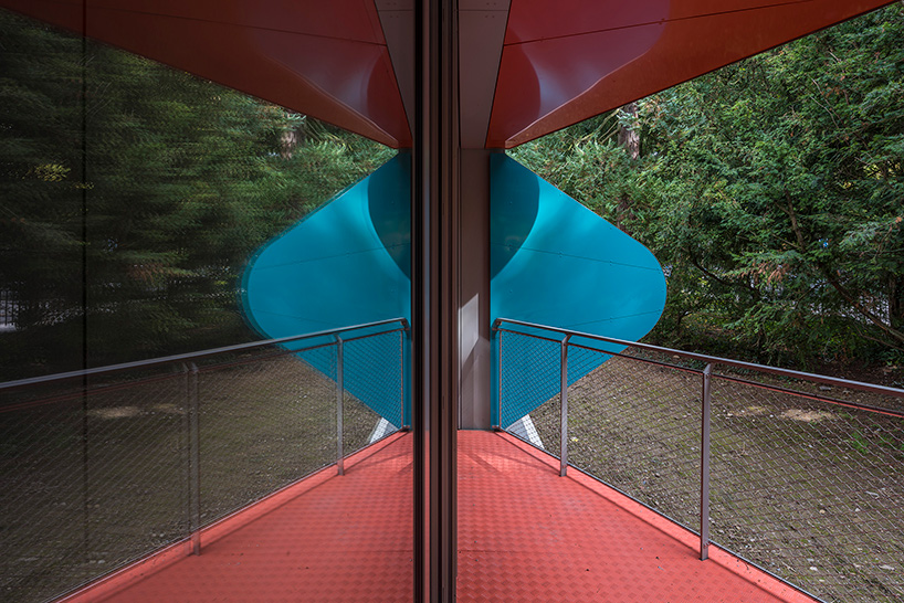 สีสันและรูปร่างสามเหลี่ยมปลายโค้งมน อันสะดุดตาบนบานพับเหล็กในบ้านหลังนี้ มีแรงบันดาลใจมาจาก“พิพิธภัณฑ์ Heidi weber” ซึ่งตั้งอยู่ห่างไปในระยะไม่เกิน 100 เมตร ออกแบบโดย Le Corbusier สถาปนิกแห่งยุคโมเดิร์นที่ใช้แม่สีและรูปทรงเรขาคณิตในการออกแบบงานสถาปัตยกรรม อีกทั้งการเคลื่อนไหวของหน้าต่าง สถาปนิกตั้งใจออกแบบให้เสมือนเป็น Kinetic art หรือศิลปะที่มีการเคลื่อนไหว ซึ่งเป็นงานศิลปะที่เจ้าของบ้านชื่นชอบ และเก็บสะสมไว้อยู่แล้ว
