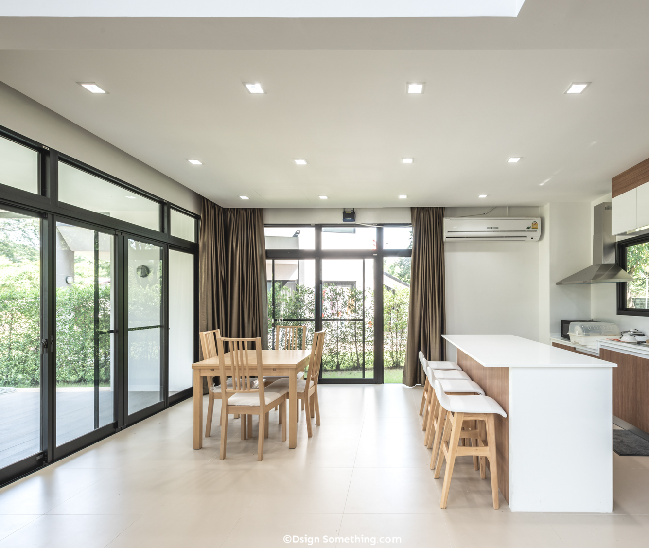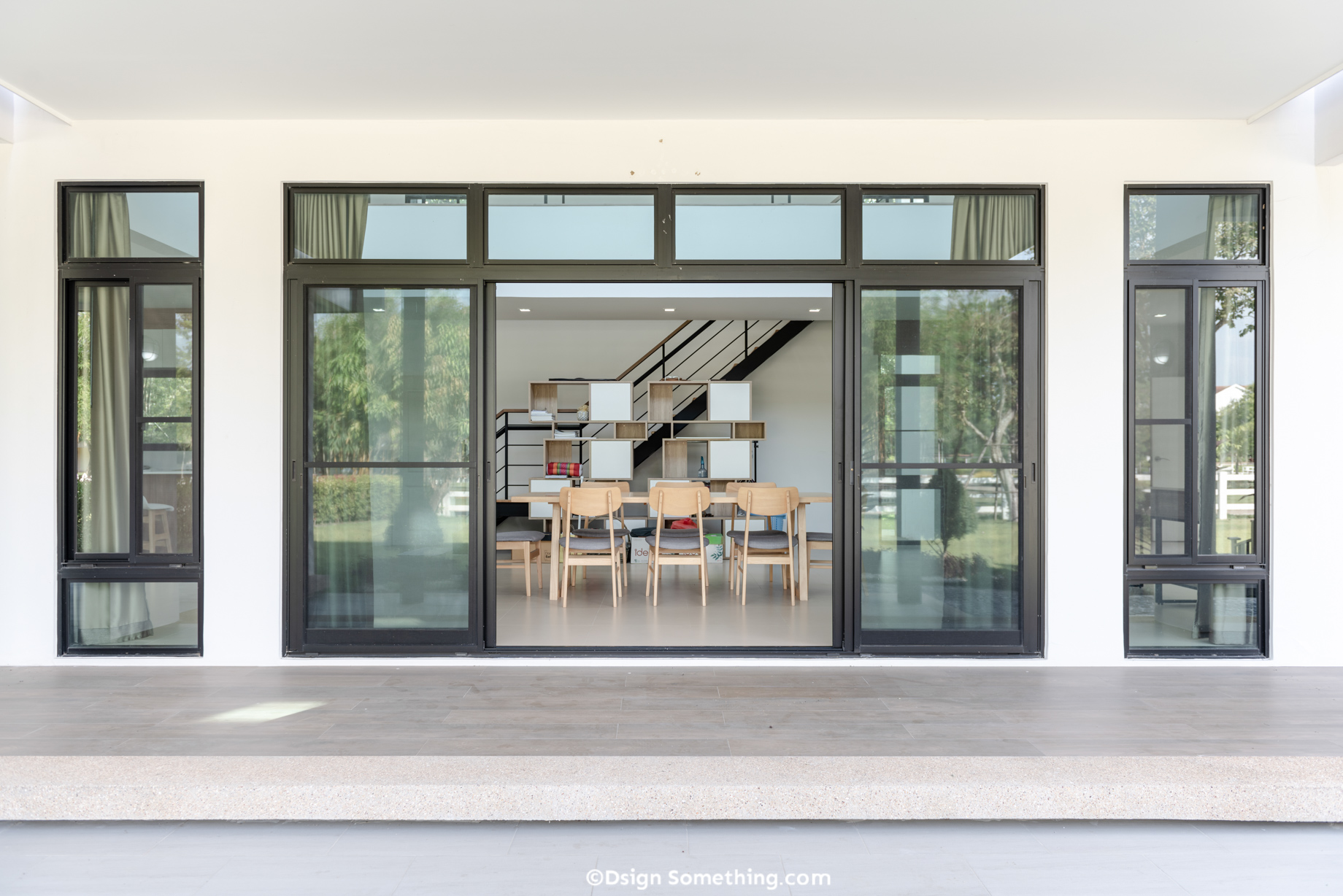 เพื่อรองรับการจัดงานเลี้ยงสังสรรค์ต้อนรับแขกผู้มาเยือนได้อย่างเป็นกันเอง ประตูบานเปิดนี้ก็ทำหน้าที่เชื่อมต่อกับเฉลียงรอบบ้านได้เป็นอย่างดี ในขณะที่เปิดเพื่อรับลมธรรมชาติเข้าสู่พื้นที่ภายใน ตอบโจทย์ในเรื่องการอยู่อาศัยที่สบาย ผ่อนคลายอีกด้วย