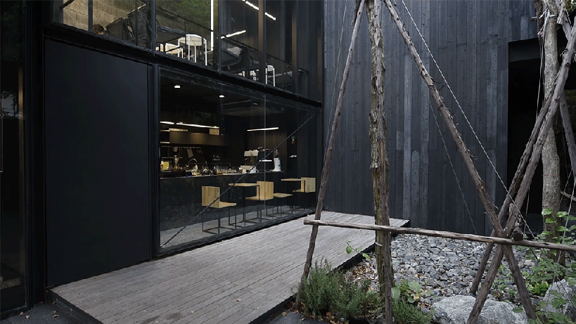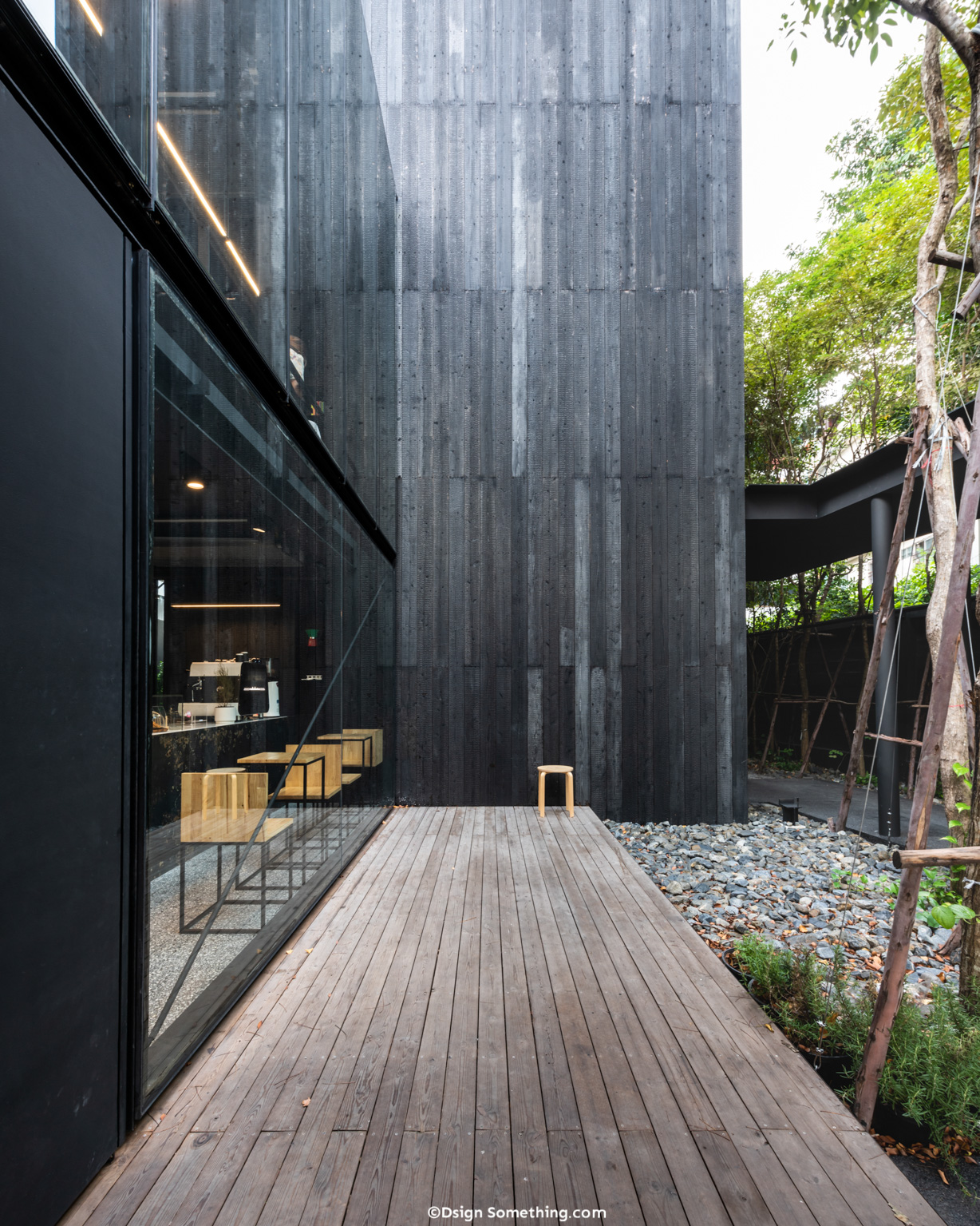 ไม่เพียงเท่านั้นทั้ง Modernism Café และ IDIN Architects ยังถูกแทรกตัวท่ามกลางธรรมชาติ กลมกลืนกับบริบทรอบข้าง และมีสเปซที่เชื่อมต่อถึงกันด้วยการใช้อิฐสีดำและไม้ยาคิสุกิ พื้นที่ของออฟฟิศจะไหลเข้ามายังส่วนร้านกาแฟ แต่ในขณะเดียวกันก็สร้างบรรยากาศ Public Space และ Private Space ให้แตกต่างกัน เพื่อเป็นการกำหนดขอบเขตของแต่ละพื้นที่