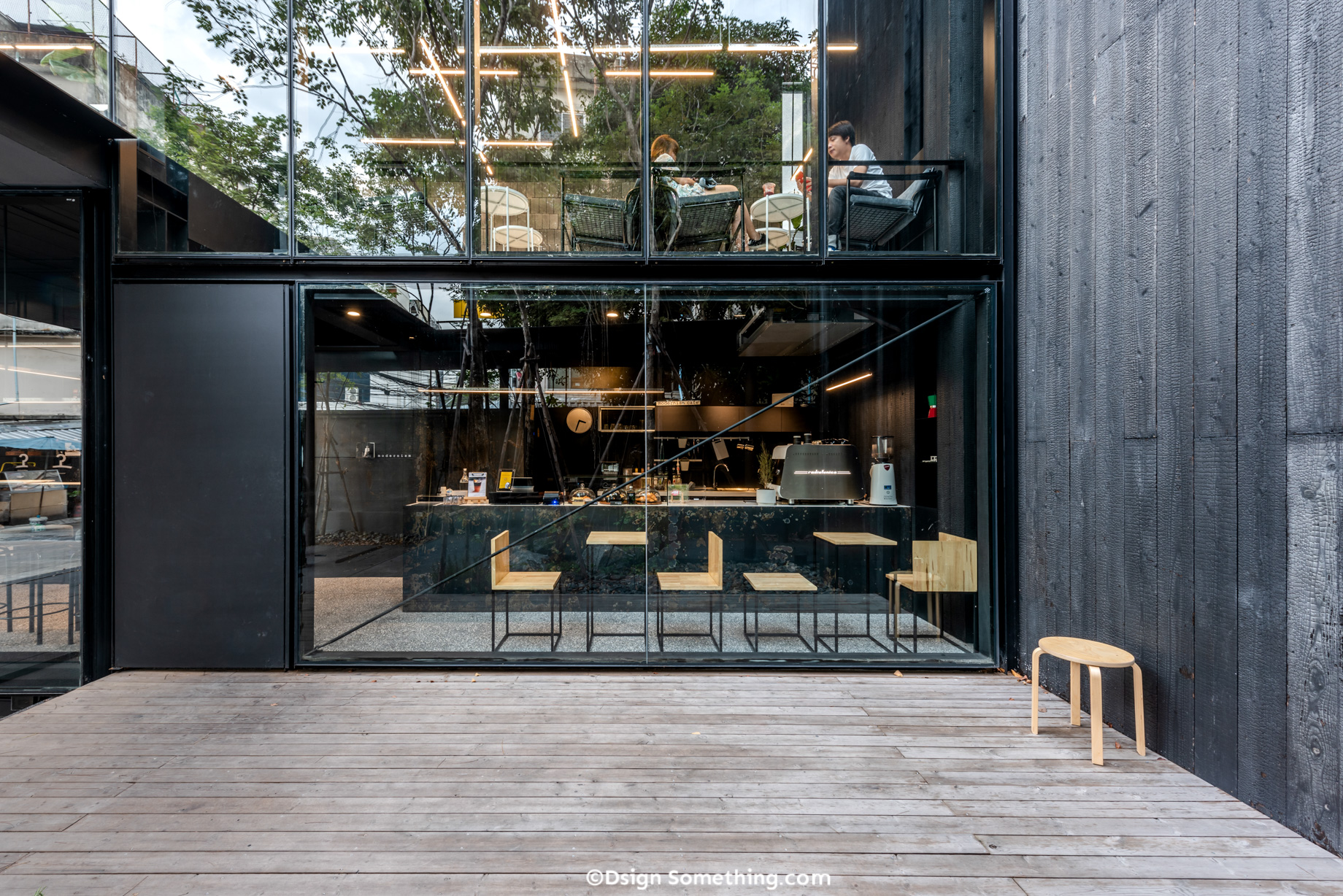 เมื่อขึ้นมาสู่ชั้น 2 จะพบกับส่วนที่นั่งซึ่งแบ่งเป็นสัดส่วนชัดเจน ด้วยการเล่นระดับพื้นที่ โดยผนังฝั่งหนึ่งเป็นอิฐสีเทาเข้ม ส่วนอีกฝั่งเป็นกระจกบานใหญ่วางเต็มพื้นที่ เพื่อเปิดรับแสงธรรมชาติในช่วงกลางวัน และสร้างบรรยากาศโปร่ง โล่ง น่าใช้งาน