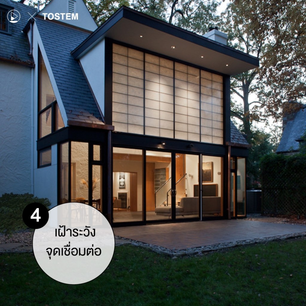 สืบเนื่องจากข้อข้างบนที่บอกว่าโครงสร้างทั้งสองห้ามติดตรึงไว้ด้วยกันโดยเด็ดขาด เรื่องสำคัญลำดับต่อมาที่ต้องใส่ใจนั่นก็คือรอยต่อระหว่างพื้นผิวของบ้านหลังเดิมและพื้นที่ใหม่ตั้งแต่ส่วนหลังคาด้านบนสุดและรอยต่อระหว่างฝาผนังสองอาคารที่มักเป็นจุดรั่วซึมของน้ำฝน ซึ่งจะเข้ามาทำความเสียหายให้ภายในพื้นที่ต่อเติมใหม่ทั้งในเรื่องความชื้นและเชื้อราที่อาจเกิดขึ้นในอนาคต รวมทั้งจุดเชื่อมต่อทุกจุดของพื้นที่ใหม่ ไม่ว่าจะเป็นกรอบวงกบประตูหน้าต่าง หรือหลังคาชายคาบ้าน