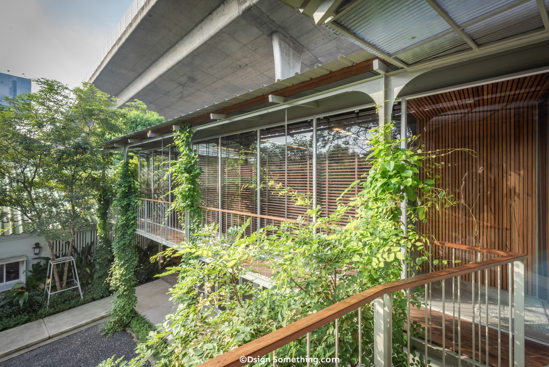 ส่วนต้นไม้ใหญ่เดิมในพื้นที่ มีการขันชะเนาะบางกิ่งของต้นชมพูพันธุ์ทิพย์ ในส่วนที่ใกล้ตัวอาคาร เพื่อให้ตัวอาคารสอดอยู่ด้านใต้ต้นไม้ได้พอดิบพอดี ซึ่งนับเป็นวิธีตอบสนองต่อสิ่งรอบข้างอย่างประนีประนอม รวมถึงการพยายามสอดแทรกต้นไม้ลงไปทุกๆพื้นที่ เช่น ไม้เลื้อยบนเสาเหล็ก เป็นภาพที่สถาปนิกตั้งใจอยากเห็น ทั้งการเจริญเติบโตของธรรมชาติ และกิจกรรมแห่งนี้ไปพร้อมกัน