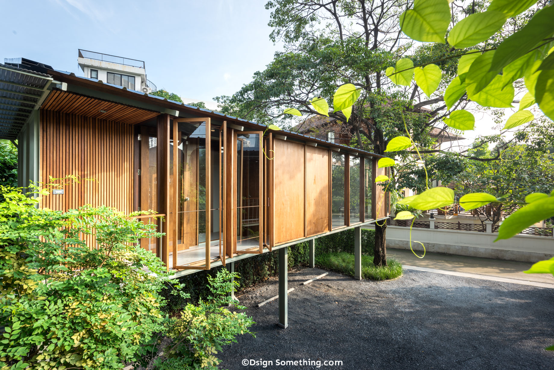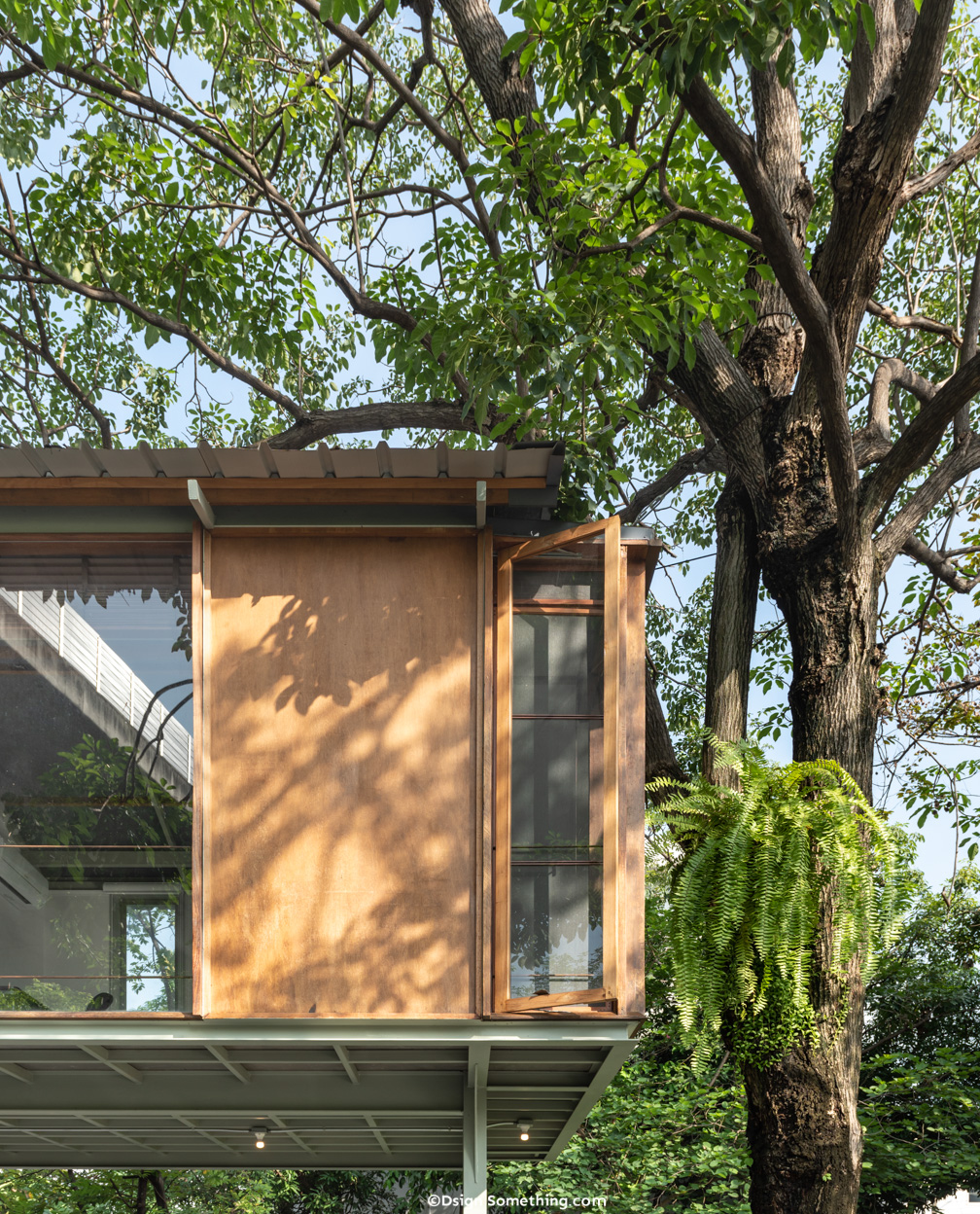 ผนังบางส่วนใช้ไม้อัดยางกันน้ำ มาทำเป็นผนังของอาคาร ได้รูปแบบและผลลัพธ์ที่น่าสนใจไม่น้อย