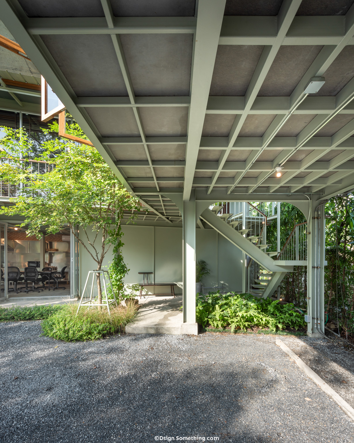 สถาปัตยกรรม 2 ชั้น ขนาดย่อมนี้มีคุณสมบัติพิเศษหนึ่ง ที่ทำให้เรารู้สึกถึงความโปร่งสบาย คือเรื่องของการยื่นยาวเกินออกมาจากแนวเส้นโครงสร้าง ไม่ว่าจะเป็นพื้น ชายคา จันทัน เกิดมิติของอาคารที่มีหน้าที่ช่วยบังแดดฝน อีกนัยหนึ่งยังช่วยให้อาคารดูเบาลอย บวกกับความบางของเส้นโครงสร้างเหล็ก ทำให้สถาปัตยกรรมชิ้นนี้โปร่งเบาโดยไม่ต้องสงสัย