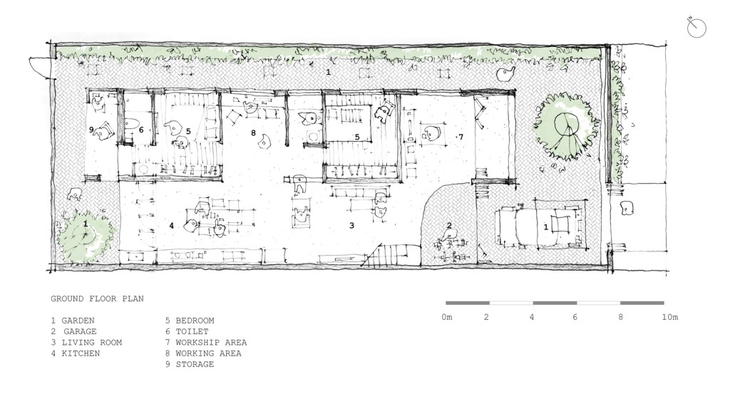 รูปสเกตซ์ที่แสดงให้เห็นพื้นที่ตรงข้ามของบ้าน ที่เป็นพื้นที่โล่งและเต็มไปด้วยพื้นที่สีเขียว