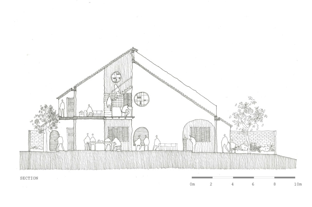 นอกจากนี้เรายังสามารถสัมผัสกับความลาดเอียงของหลังคาได้ในทุกๆพื้นที่ ให้บรรยากาศของความเป็นบ้านในรูปแบบดั้งเดิม พร้อมสทั้งมีการเจาะช่องผนังด้านบน เพื่อให้แสงและลมผ่านเข้าออกภายในบ้านได้ตลอดวัน