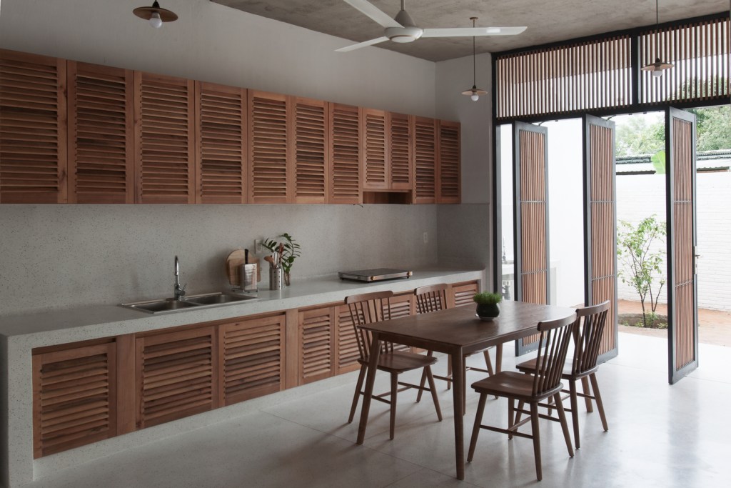 ความลาดเอียงของหลังคาในลักษณะนี้ทำให้พื้นที่การใช้งานฟังก์ชันต่างๆ ภายในบ้านดูโปร่งโล่ง ไม่ทึบตัน รวมถึงประตูบานเปิดไม้ ที่เลือกเปิดเพื่อต้อนรับแสงแดดและลมธรรมชาติเข้ามาสู่พื้นที่ระเบียงได้ และปิดเมื่อต้องการเป็นส่วนตัว