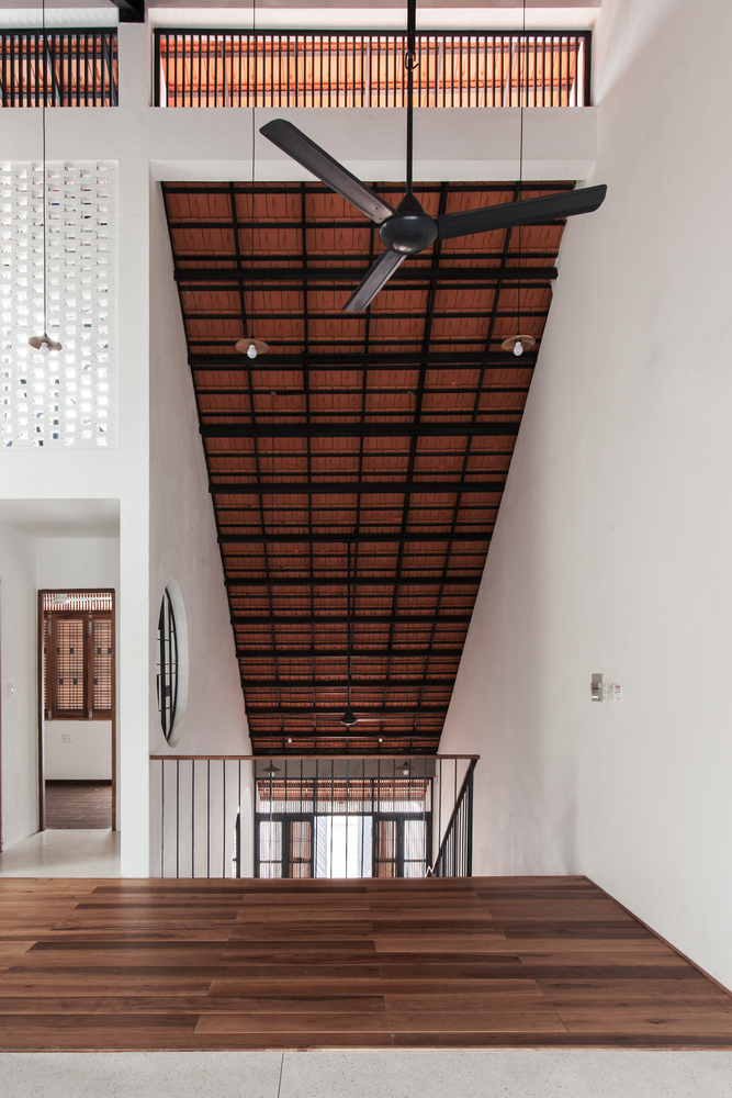 สถาปนิกได้คงรูปแบบลักษณะจั่วหลังคาแบบดั้งเดิมของเวียดนามไว้ แต่ปรับเปลี่ยนระดับความลาดเอียดของหลังคา และเพิ่มระดับความสูงต่ำที่ทำให้เกิดช่องว่างระหว่างหลังคา เพื่อให้แสงและลมสามารถพัดผ่านเข้ามาได้ โดยช่องว่างนั้นมีการติดตั้งระบบประตูม้วน (Shutter door system) เพื่อปรับระดับการถ่ายเทหมุนเวียนอากาศภายในบ้าน ไม่ให้แรงไปหรือเบาไป