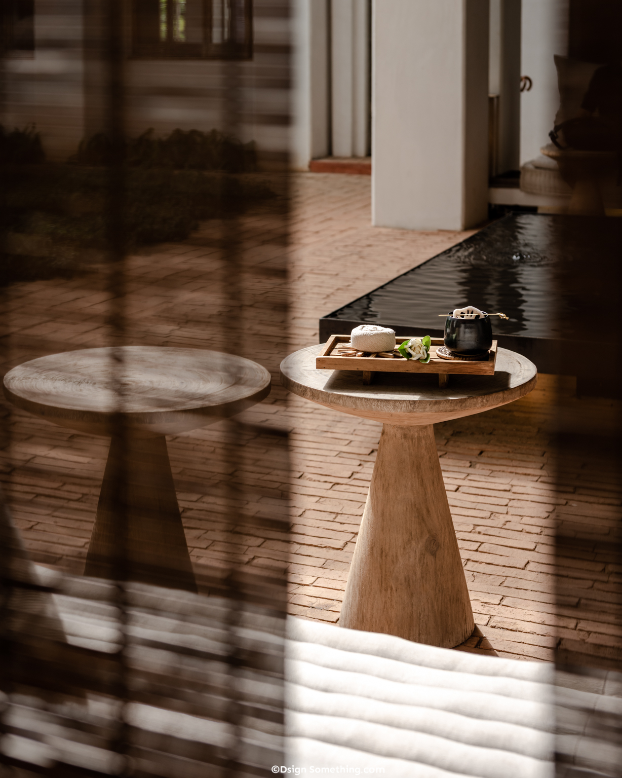 สถาปนิกตั้งใจออกแบบพื้นที่โถงต้อนรับให้มีความโปร่งโล่ง ฝ้าเพดานสูง เสาขนาดใหญ่และสูงกว่าปกติ และสร้างจังหวะการจัดเรียงในระยะที่เท่ากันเพื่อให้เกิดภาษาที่ถ่ายทอดกลิ่นอายของล้านนา ส่วนพื้นที่ภายในคอร์ทกลาง เป็นที่ตั้งของต้นสะเดา และต้นกระท้อน ต้นไม้สูงใหญ่ที่เป็นดั่งใจกลางแห่งความร่มรื่นของส่วนต้อนรับ เชื่อมต่อไปยังต้นไม้นานาพรรณ ทั้งไม้พุ่ม และสนามหญ้าที่ทอดยาวไปจนสุดขอบของแม่น้ำปิง