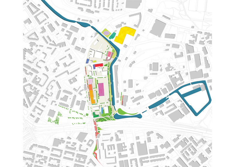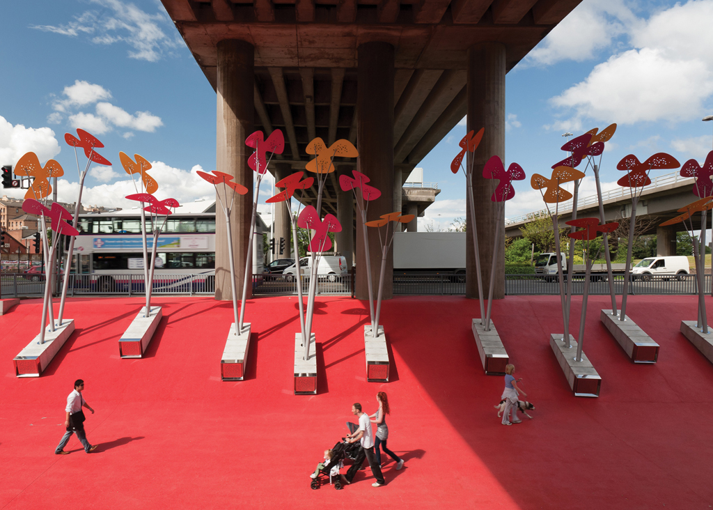สถาปนิกได้ออกแบบพื้นผิวเรซิ่นสีแดง โดยไม่จำกัดการใช้งานภายในพื้นที่กับเส้นทางของการปั่นจักรยาน บวกกับออกแบบประติมากรรมดอกไม้ที่ทำจากอลูมิเนียม 50 สีด้วยกัน เป็นที่นั่งพักผ่อนหย่อนใจ รวมถึงเชื่อมต่อเส้นทางสัญจรเท้าและจักรยานผ่านไปยังพื้นที่ริมน้ำสู่ใจกลางของย่าน ซึ่งทั้งหมดนี้เป็นแนวคิดที่มองเห็นศักยภาพที่มีอยู่ในสภาพปัจจุบัน โดยการแปลงและยกระดับพื้นที่ที่ควรค่าแก่พัฒนา เพื่อให้บริบทของเมืองเป็นไปในทิศทางที่ดีขึ้น
