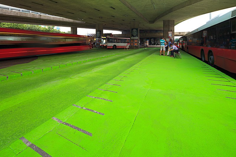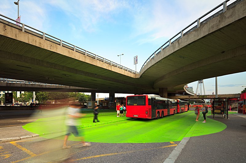 จากสภาพแวดล้อมที่ย่ำแย่ภายใต้พื้นที่รอรถโดยสารประจำทางใต้สะพานใหม่ ในย่านบราติสลาวาประเทศสโลวาเกีย ทำให้ผู้คนต้องรอรถบัสในพื้นที่ที่ไม่เหมาะสม รู้สึกไม่ปลอดภัยเป็นเวลายาวนาน การรวมกลุ่มระหว่างคนที่ต้องการแก้ไขปัญหาเหล่านี้อย่างUrban Interventions ได้จับมือกับบริษัทสถาปนิก Vallo Sadovský Architects จึงเกิดขึ้น เพื่อออกแบบแก้ไขพื้นที่ด้วยวิธีที่ง่ายและถูกที่สุด ด้วยการทาสีเขียวบนพื้นถนนแบบไร้รูปร่างพื้นที่ประมาณ 1,000 ตารางเมตร และสร้างเส้นสายของเครื่องหมายการจราจร รวมถึงจุดรอรถบัสต่างๆขึ้นมา เพื่อสร้างขอบเขตที่ชัดเจนการใช้งาน