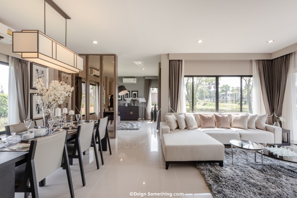 ลักษณะการวางผังภายในบ้านเป็นแบบ Open plan เชื่อมต่อพื้นที่จากส่วนนั่งเล่นและรับประทานอาหารเข้าด้วยกัน แต่ในส่วนของครัวถูกแยกออกไปอย่างชัดเจน เพื่อความเป็นสัดส่วนด้านการใช้งาน