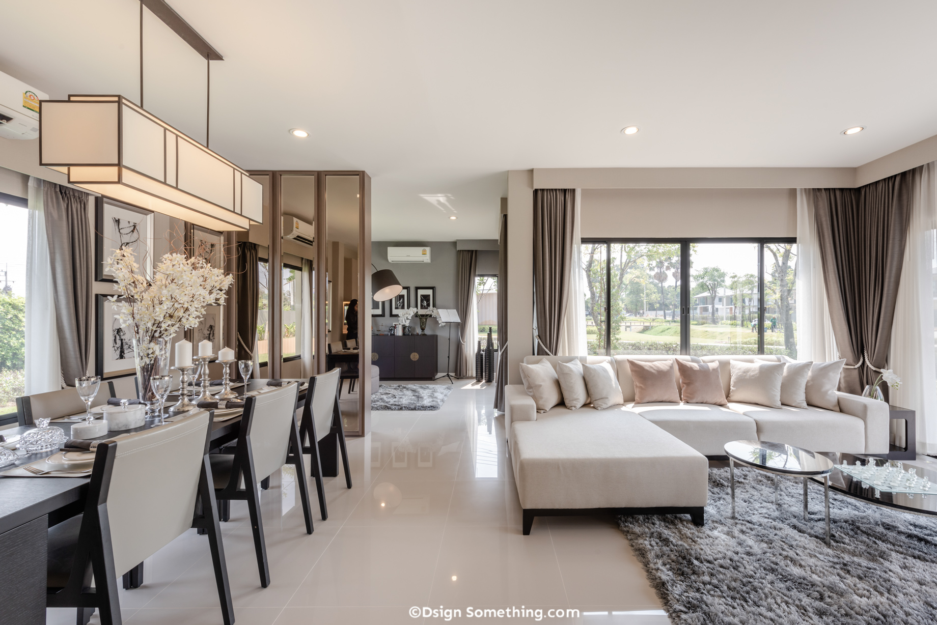 ห้องนั่งเล่นที่กว้างขวางบวกกับแนวคิดการเชื่อมต่อพื้นที่จากภายในสู่ภายนอก ทำให้ผู้อยู่อาศัยได้สัมผัสบรรยากาศที่รายล้อมไปด้วยธรรมชาติ