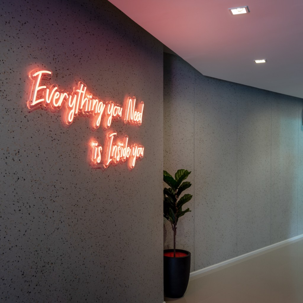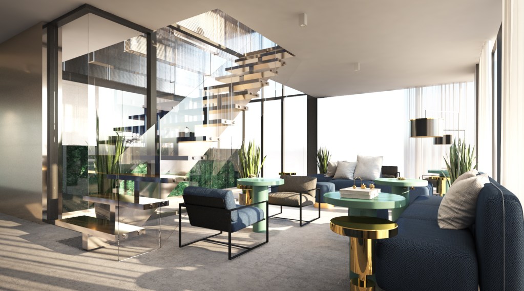 ภายในโครงการเน้นสเปซที่โปร่งโล่งให้ความรู้สึกถึงความแกรนด์ของพื้นที่ต้อนรับ มองตรงเข้าไปจะเจอเคาน์เตอร์หินอ่อนดูหรูหรา พิเศษด้วยทำซุ้มโค้งทรง Arch เช่นเดียวกับภายนอกเพียงแต่เปลี่ยนวัสดุเป็นอลูมิเนียมเพื่อให้ลุคและบรรยากาศดูโมเดิร์นตรงกับกลุ่มลูกค้าของทางโครงการที่เจาะกลุ่มวัยทำงานอายุ 28 ปี ขึ้นไปที่ทำงานละแวกลาซาล รวมถึงกลุ่มคนทำงานในเมือง อย่างบริเวณอโศกและสีลม