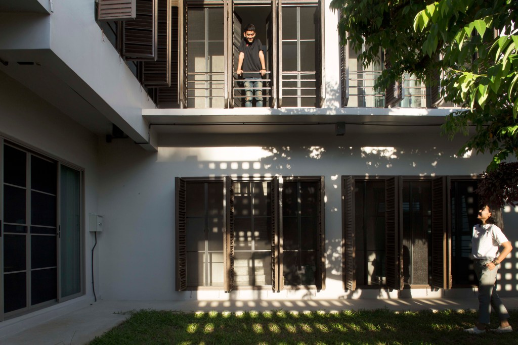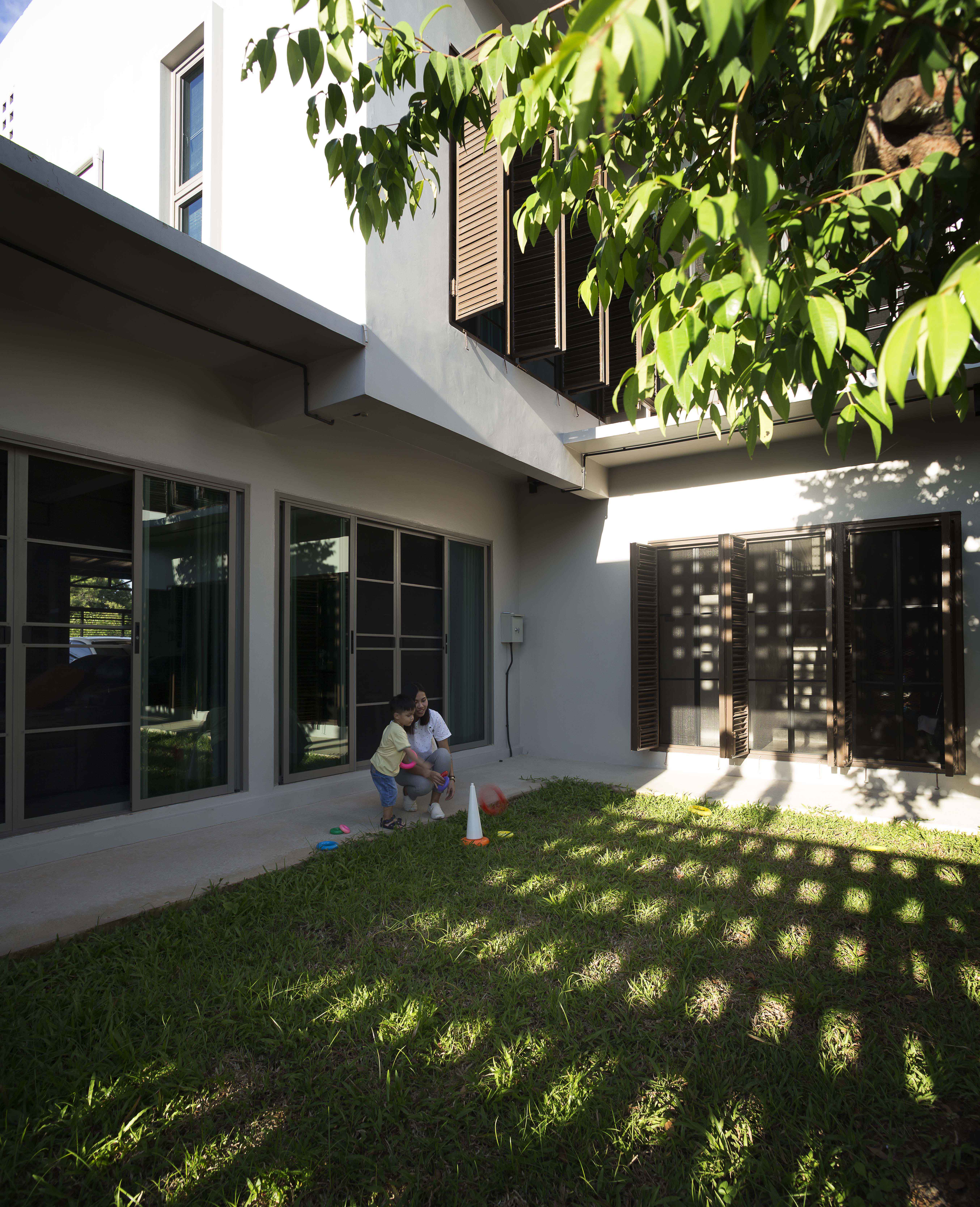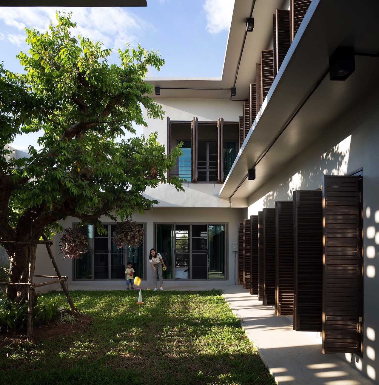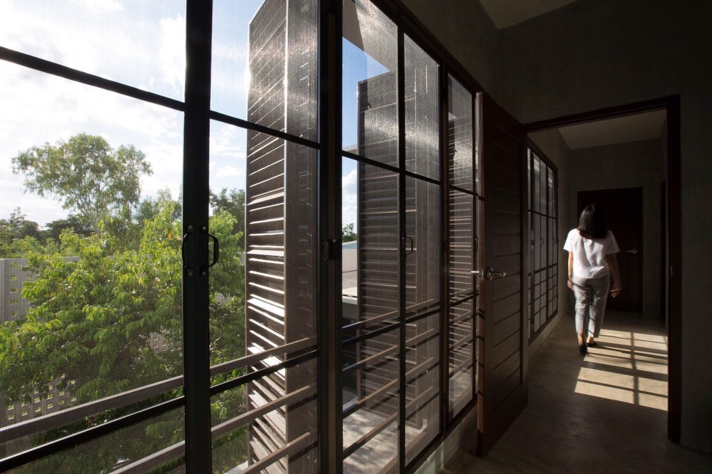ความพิเศษของการออกแบบช่องเปิดภายในบ้านหลังนี้ ไม่ว่าจะเป็นส่วนของทางเดิน และห้องนอน ก็มีช่องเปิดที่เปิดสู่คอร์ทยาด โดยเป็นหน้าต่างแบบดับเบิ้ลสกิน หรือหน้าต่างสองชั้น ด้านนอกเป็นบานเกล็ดที่มีมุ้งลวดซ่อนอยู่ภายใน หากต้องการความเป็นส่วนตัว ก็สามารถปิดตัวบานเกร็ดนี้เพื่อพรางมุมมองจากภายนอกได้ ในขณะที่ยังมีการระบายอากาศได้ดี หากต้องการให้พื้นที่เปิดโล่ง เชื่อมต่อกับบรรยากาศภายนอกอย่างเต็มที่ ก็เพียงแค่เปิดทั้งหมด