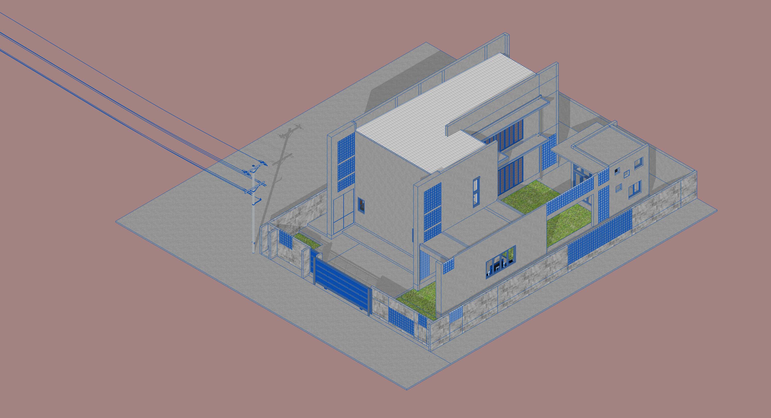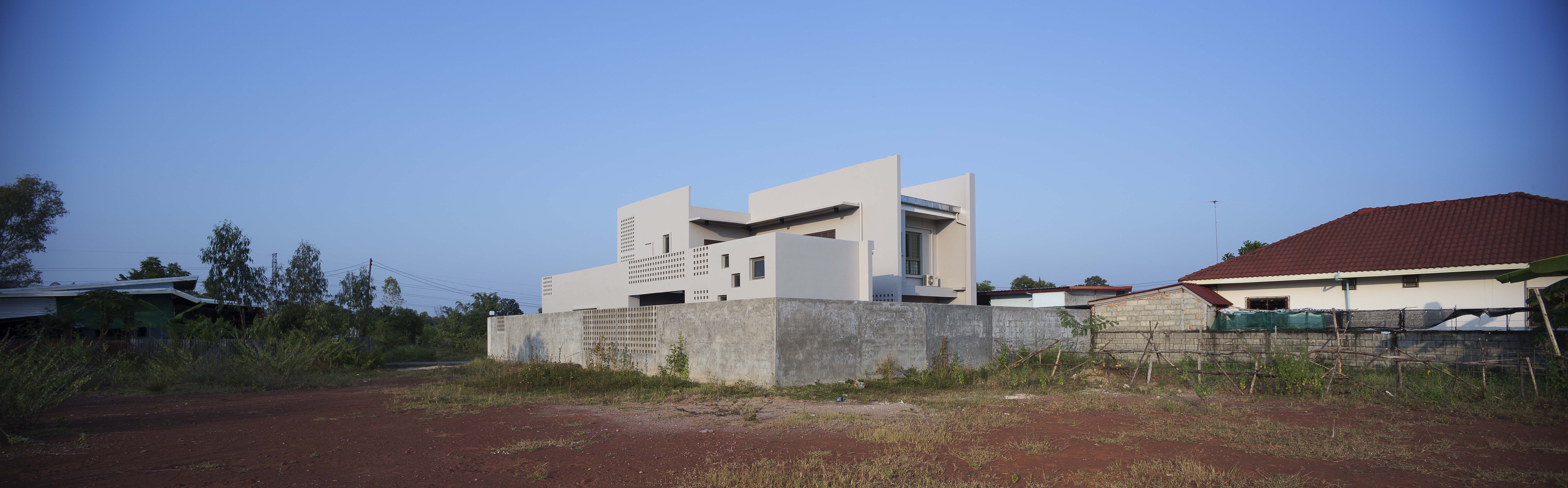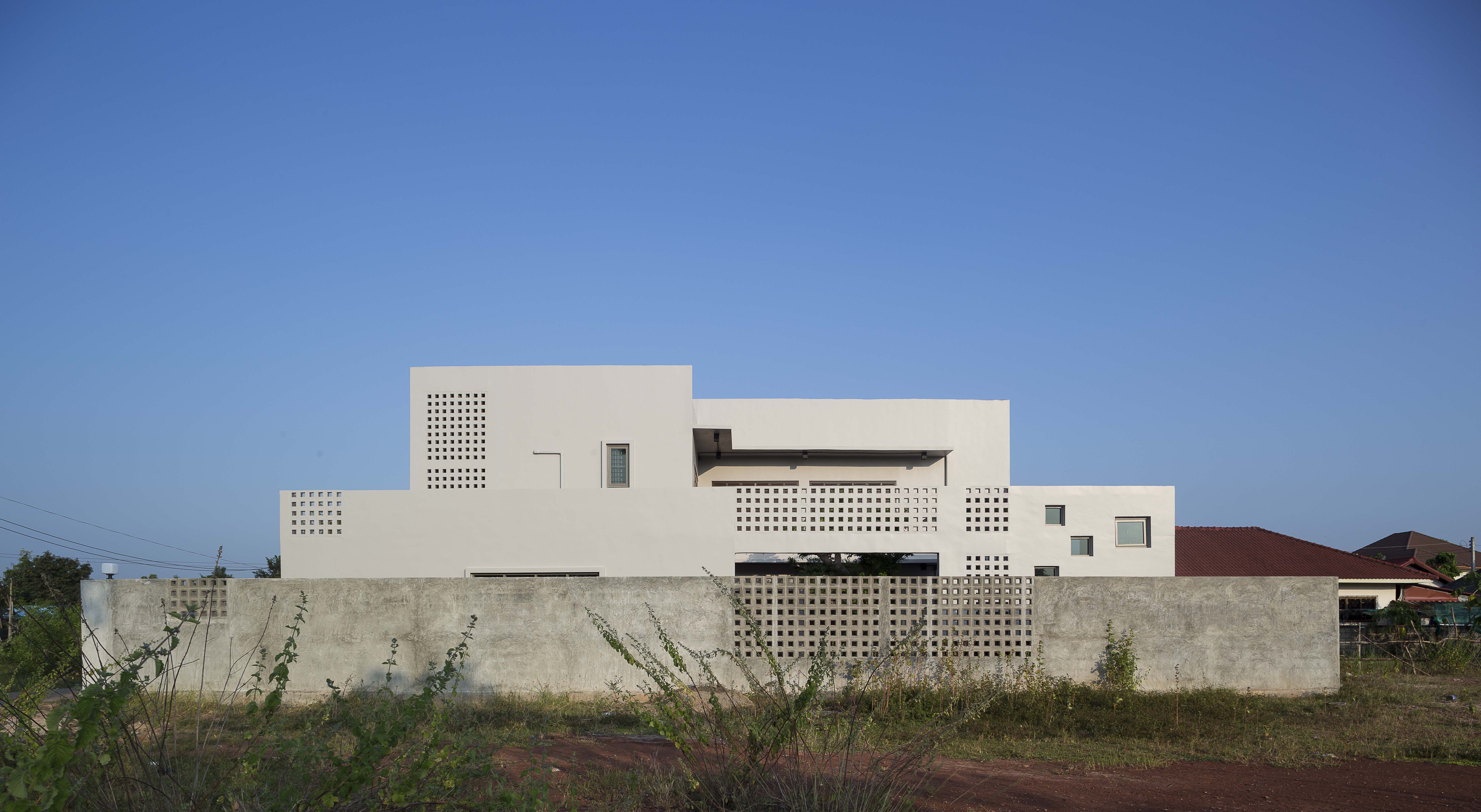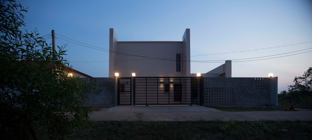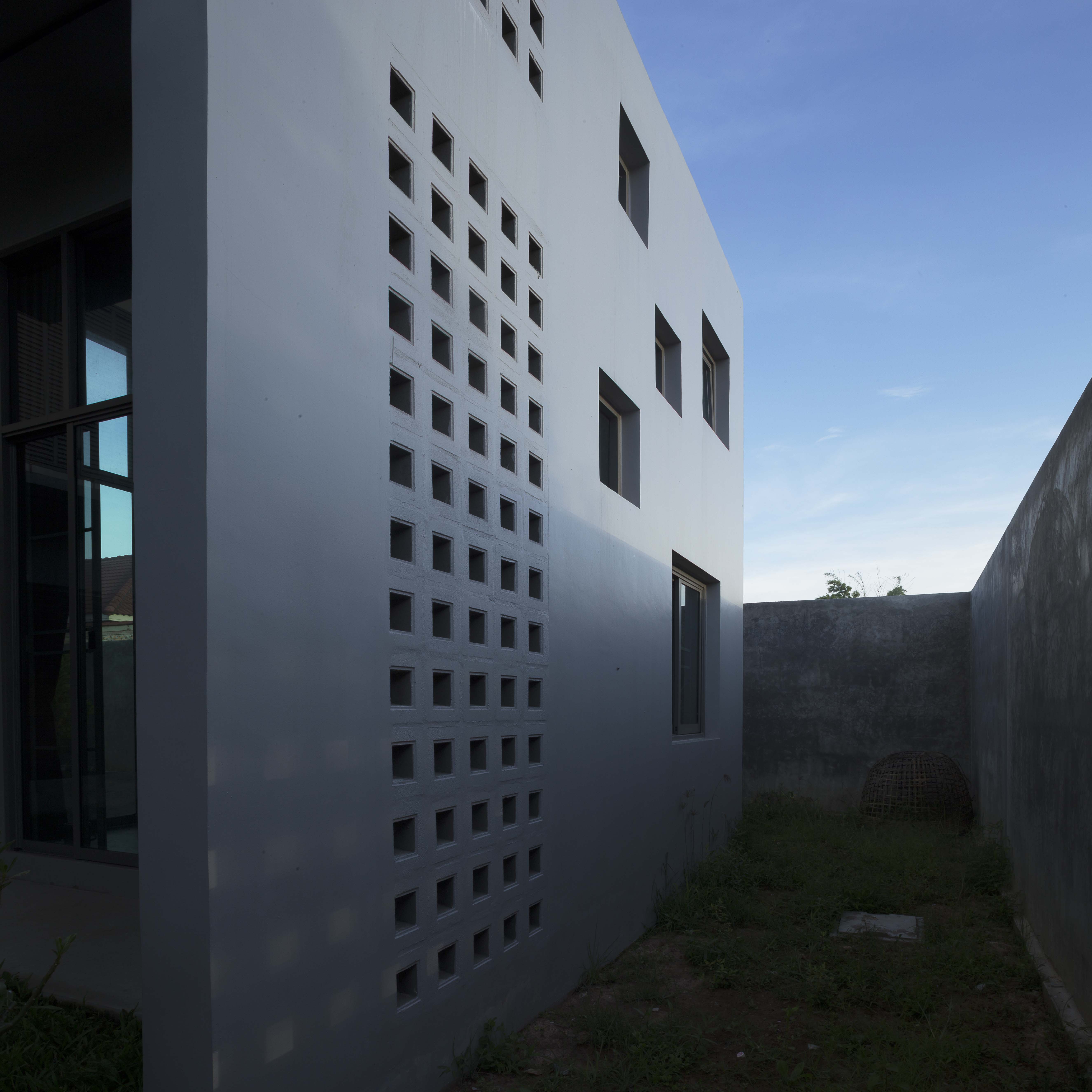 เนื่องจากเจ้าของบ้านเป็นคู่สามี-ภรรยา ที่มีลูกชายตัวเล็กๆหนึ่งคน โจทย์แรกที่สถาปนิกได้รับคือ เรื่องของความเป็นส่วนตัวจากมุมมองภายนอก แต่ภายในซุกซ่อนความโปร่งสบายไว้ให้ได้มากที่สุด สถาปนิกจึงออกแบบกรอบของบ้านเป็นผนังที่ค่อนข้างทึบ และเลือกใช้วัสดุ “อิฐช่องลม” ในขนาดสี่เหลี่ยมจตุรัส วางในตำแหน่งที่ต้องการเพื่อให้พื้นที่ภายในมองเห็นภายนอกได้ ในขณะที่ภายนอกมองเข้ามาได้ค่อนข้างยาก อีกทั้งยังทำให้เกิด Ventilation ลมพัดผ่านเข้าสู่ตัวบ้านได้ ในขณะที่ภายในสร้างคอร์ทยาด และเปิดมุมมองทุกห้องภายในบ้านให้เชื่อมต่อ