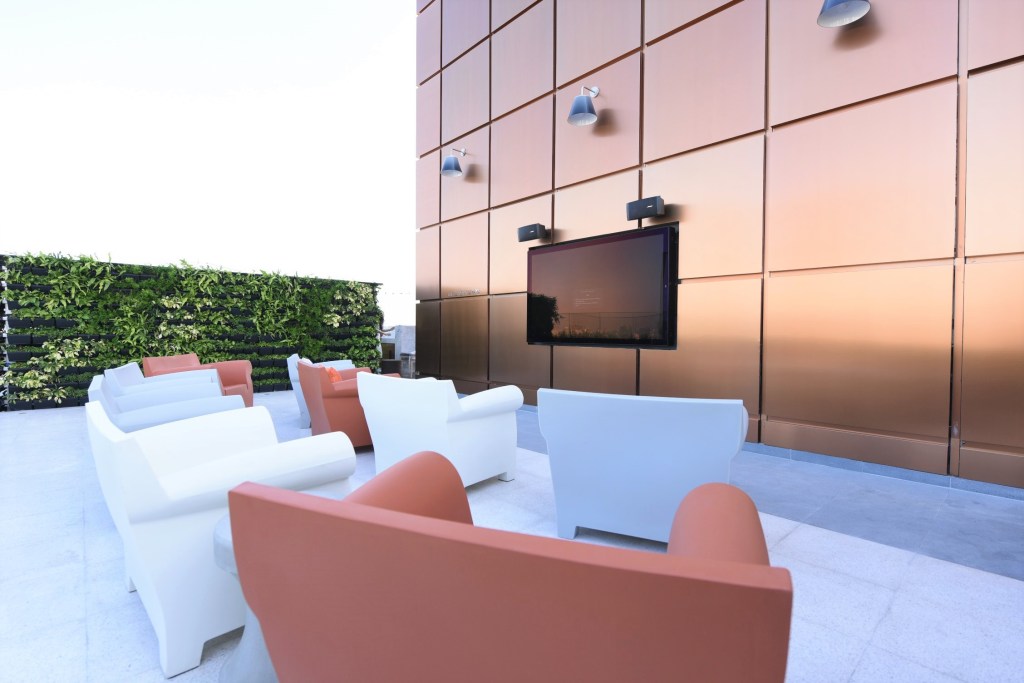 ส่วนพื้นที่บริเวณดาดฟ้าของโครงการยังออกแบบเป็นพื้นที่พักผ่อนสำหรับผู้อยู่อาศัยหลากหลายรูปแบบ โดยแบ่งเป็นส่วน The sky Lawn สนามหญ้าเปิดโล่งที่สามารถทำกิจกรรมได้หลากหลาย KHUN Bar พื้นที่บาร์เอาท์ดอร์ พื้นที่ The Screening Yard หรือพื้นที่ดูหนังเอาท์ดอร์ซึ่งมีทีวีขนาดใหญ่ที่สั่งทำขึ้นพิเศษเพื่อรองรับการใช้งานภายนอกได้ และพื้นที่ TheRooktop โซนเกมแบบเอาท์ดอร์ซึ่งในโซนนี้เราจะเห็นตารางหมากรุกขนาดใหญ่ซึ่งมีสีสันสดใส ให้บรรยากาศขี้เล่น เป็นกันเองมากขึ้น