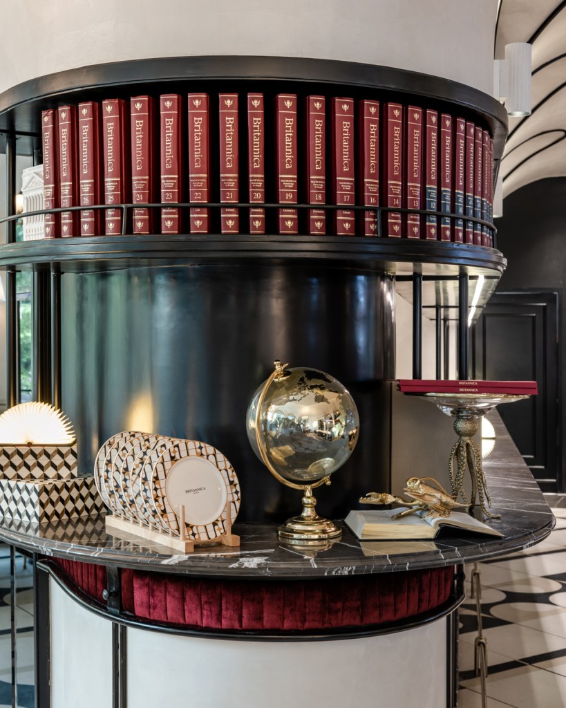 นอกเหนือจากการสร้างบรรยากาศที่เป็นประตูสู่โลกแห่งความอร่อย จุดมุ่งหมายของสถาปนิกยังต้องการให้ดีไซน์เป็นส่วนเสริมให้ลูกค้าได้รับประสบการณ์จากสารพัดความรู้เสมือนอยู่ในห้องสะสมความรู้ และเลือกที่จะสร้างคาแรกเตอร์ของ Britannica Brasserie ด้วยการเล่นกับเรื่องราวของประสบการณ์ที่เจ้าของร้านเคยพบเจอมา
