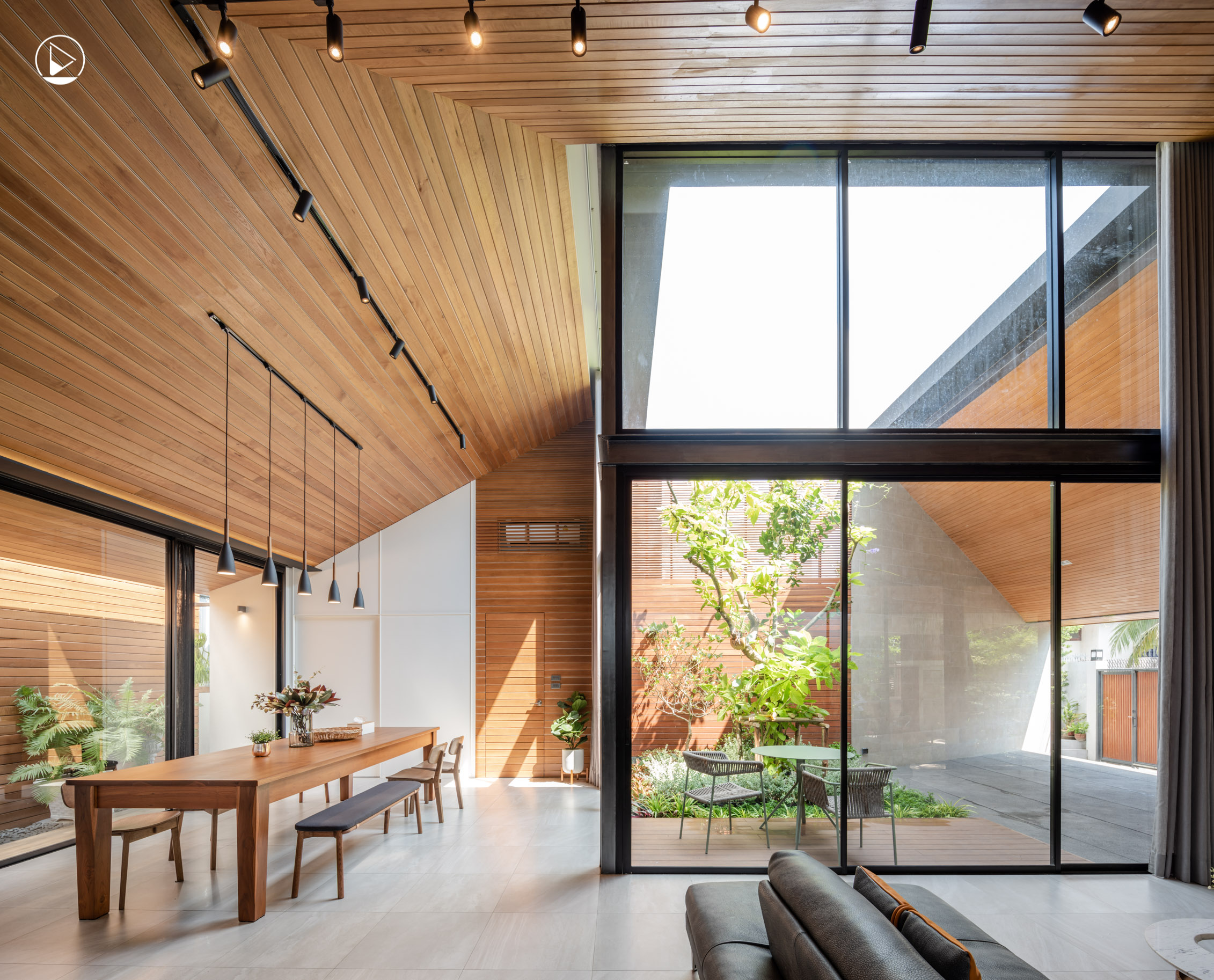 ฝ้าไม้บริเวณหลังคาที่เรามองเห็น ถือเป็นพระเอกของบ้านหลังนี้ ทำหน้าที่ห่อหุ้มบ้านตั้งแต่ภายในจนถึงภายนอก ทำให้ผู้อยู่อาศัยรู้สึกถึงการเชื่อมต่อระหว่างภายในและภายนอก นอกจากนั้น ‘ไม้’ ยังช่วยดูดซับเสียงได้ดี เมื่อมีการเล่นดนตรีซึ่งเป็นกิจกรรมที่ลูกสาวชื่นชอบอีกด้วย