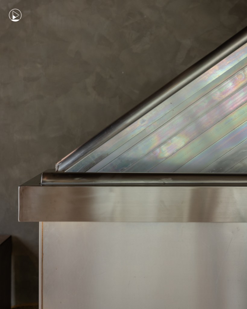 วัสดุส่วนใหญ่ที่นำมาใช้ในร้านเป็นโลหะ สแตนเลส แผ่นโครเมต และอะลูมิเนียม ที่ไม่ได้มีดีแค่เป็นหน้าเป็นตาที่สร้างภาพลักษณ์เท่ๆ ให้กับตัวร้าน แต่เป็นความตั้งใจที่อยากจะหยิบจับวัสดุของเดิมธรรมดาๆ มาปรับมุมมอง และแปรสภาพใช้งานในรูปแบบใหม่ในบริบทที่แตกต่างออกไป ไม่ว่าจะเป็นคิ้วอะลูมิเนียมต่างๆ ที่ปกติแล้วจะอยู่ตามมุมเสา เฟรมที่ไว้ใส่หน้าต่างหรือประตูบานเลื่อนก็ถูกนำมาสร้างสรรค์ให้เป็นวัสดุตกแต่งผนังและเคาน์เตอร์ของคาเฟ่ได้อย่างกลมกลืน
