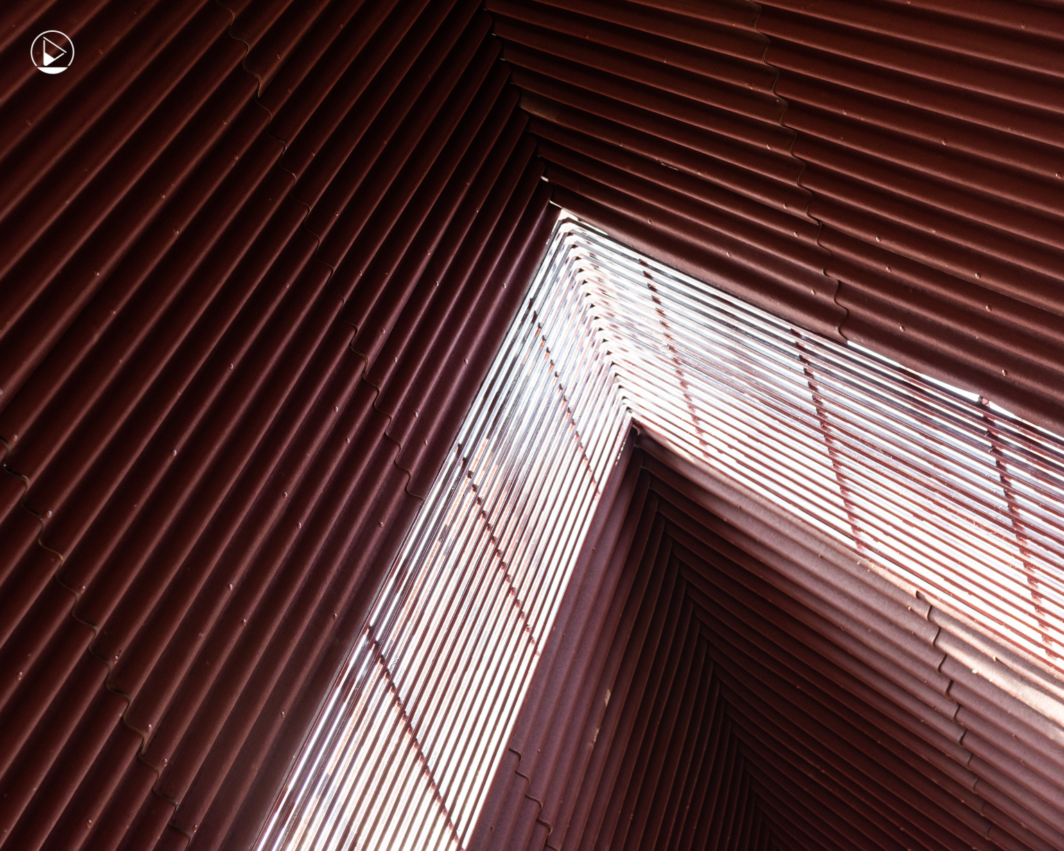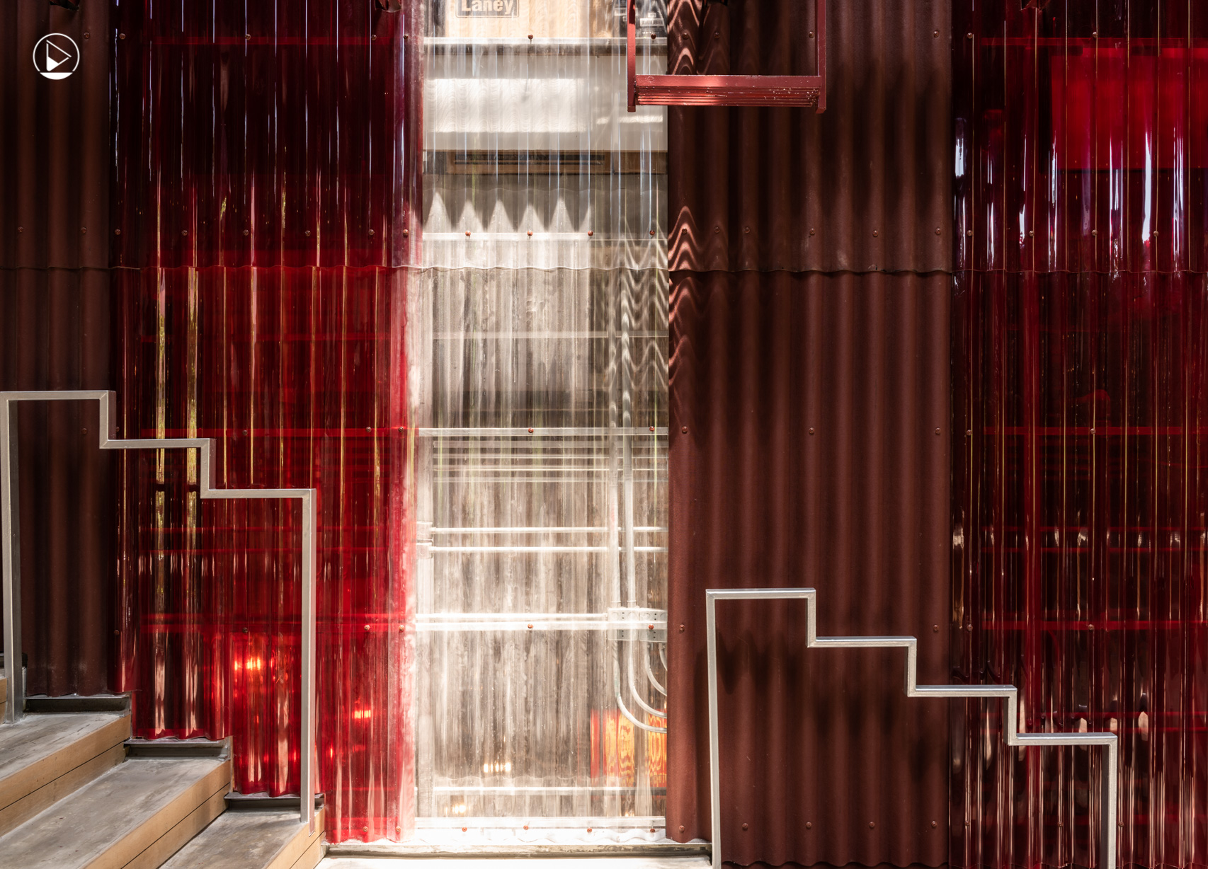 ส่วน สีแดง นั้นถูกนำเสนอผ่านเรื่องของวัสดุ ซึ่งคุณอมตะเองเลือกใช้แผ่นลอนที่ทำด้วยยางเรียกว่า ‘ออนดูลีน’ ซึ่งมีสีแดงเลือดหมูที่ส่งเสริมให้ตัวอาคารดูเท่มากขึ้น และมีลักษณะเป็นลอนละเอียดที่ชวนให้นึกถึงลอนของหลังคาบ้านในอดีต แต่เพื่อเพิ่มลูกเล่นให้กับอาคาร คุณอมตะยังเลือกใช้วัสดุที่เป็นลอนเดียวกัน แต่มีสีใสและสีใสแดง ทำให้สามารถมองเห็นได้จากข้างใน สร้างความต่อเนื่องระหว่างภายนอกและภายในให้มากขึ้น เมื่อมีบางองศาของวัสดุที่กระทบกับแสงแดด จะเกิดเงาสีแดงพาดเข้ามายังอาคาร เพื่อเตือนให้คนนึกถึงความเป็นศาลาแดงได้นั่นเอง