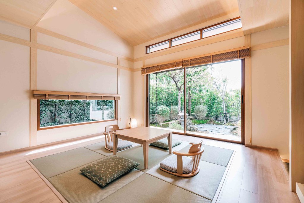 พื้นที่ด้านข้างบ้านได้ต่อเติมเป็นเรือนไม้แบบญี่ปุ่น โดยใช้ไม้เผาไฟสีดำกรุรอบตัวบ้านเพื่อให้ตัดกับตัวบ้านหลังใหญ่ซึ่งเป็นสีขาว และเป็นฉากให้กับสวนญี่ปุ่น ซึ่งจะช่วยขับให้สวนมีความสวยงามยิ่งขึ้น ภายในออกแบบให้เป็นส่วนนั่งเล่นที่ปูด้วยเสื่อทาทามิสำหรับพักผ่อนเพื่อชมสวนหรือจิบชายามบ่าย และมีห้องอาบน้ำในตัวที่สามารถนอนแช่น้ำพร้อมกับชมสวนไปด้วยในตัว