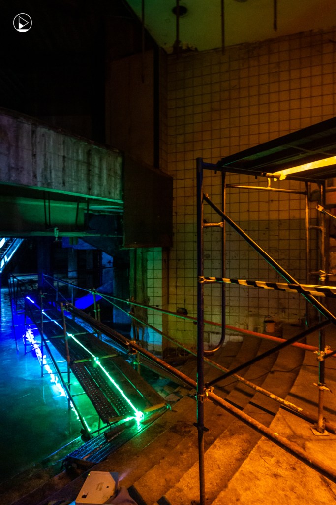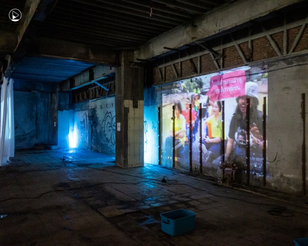 ด้วยความที่บรรยากาศภายในห้างเก่า และค่อนข้างมืดมาก รวมถึงกว้างใหญ่จนโหวงเหวง ในการนำเสนอ จึงตั้งใจสร้างบรรยากาศให้มีสีสัน และมีชีวิตชีวามากขึ้นด้วยการจัดแสงเพื่อเล่าเรื่องของย่านบางลำพูผ่าน Lighting Installation โดยบริเวณชั้นล่างของอาคารจะมีการฉายโปรเจกเตอร์สีสันต่างๆ รวมถึงภาพปลาที่แหวกว่ายไปมาลงบนโครงสร้างและพื้นผิวดิบๆ ของอาคาร เพื่อสะท้อนให้เห็นถึงความเป็น ‘วังมัจฉา’ หรือยุคสมัยหนึ่งของนิวเวิล์ดที่ผู้คนจดจำได้นั่นเอง