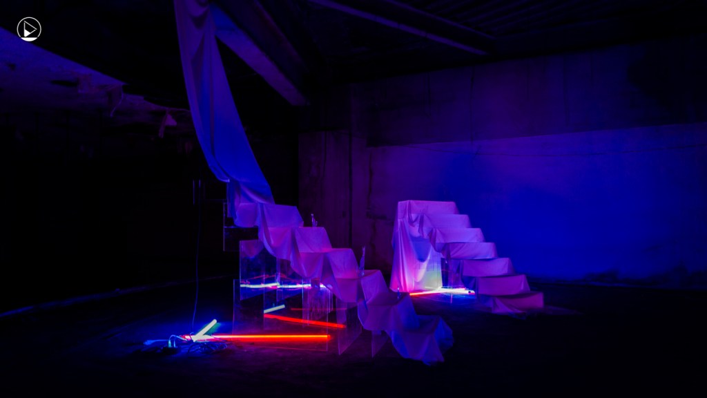 อีกหนึ่งส่วนของนิทรรศการ Lighting Installation จะถูกจัดแสดงที่บริเวณชั้นสอง โดยบันไดคลุมด้วยผ้าที่เราเห็น แสดงแนวคิด มองถึงอนาคตของนิวเวิล์ด ที่อาจจะถูกพัฒนาไปได้หลายทิศทาง ไม่แน่นอนและยังคงคลุมเครือ รอให้หลายๆ คนหาคำตอบไปด้วยกัน