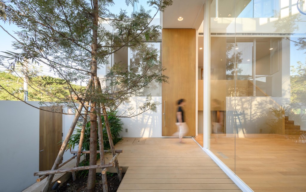 “ถ้ามองจากภายนอกจะมีเพียงแมททีเรียลสีขาว กระจก เพราะเราพยายามออกแบบให้บ้านดูคลีนที่สุด หมายความว่า ช่องเปิด จะเปิดเมื่อต้องการเชื่อมต่อผู้อยู่อาศัย แสง และต้นไม้เท่านั้น” สถาปนิกกล่าว นั่นคือเหตุผลว่าทำไมเราจึงเห็นบ้านทั้งสองหลังเส้นสายเฉียบคมตรงไปตรงมา หน้าต่างเป็นกระจกเปิดกว้างตั้งแต่พื้นจรดฝ้า และเชื่อมต่อมุมมองออกไปสู่พื้นที่ธรรมชาติ อย่างคอร์ทยาดที่ถูกออกแบบไว้ทั้งหน้าบ้าน กลางบ้าน และหลังบ้าน เติมเต็มบรรยากาศร่มรื่นภายในบ้านและทำให้บ้านดูชีวิตชีวามากยิ่งขึ้น