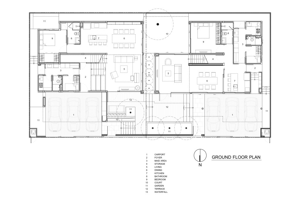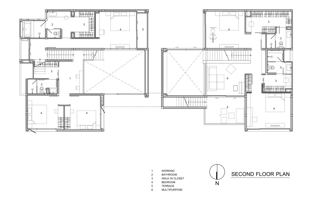 แม้รูปแบบการใช้ชีวิตจะต่างกัน แต่บ้านทั้งสองก็มี ‘ความลื่นไหลของพื้นที่’ จากจุดหนึ่งไปยังบ้านอีกหลังหนึ่งเสมอ เช่น บ้านทั้งสองมีทางเข้าสู่ตัวบ้านสองทางด้วยกัน หนึ่งคือจากโรงจอดรถ และสองจากระเบียงหน้าบ้านกว้างที่เชื่อมถึงกันและกัน ซึ่งเป็นพื้นที่ที่ถูกออกแบบไว้เพื่อให้สมาชิกของทั้งสองบ้านไปมาหาสู่กันได้อย่างสะดวกสบาย รวมถึงดาดฟ้าชั้นบนสุดที่เชื่อมต่อออกมาจากห้องmulti-purpose ของบ้านทั้งสองหลัง นอกจากจะเป็นพื้นที่กิจกรรมของครอบครัวแล้ว ยังสามารถใช้พื้นที่เหล่านี้เพื่อต้อนรับเพื่อนที่มาเยี่ยมเยียนได้อีกด้วย