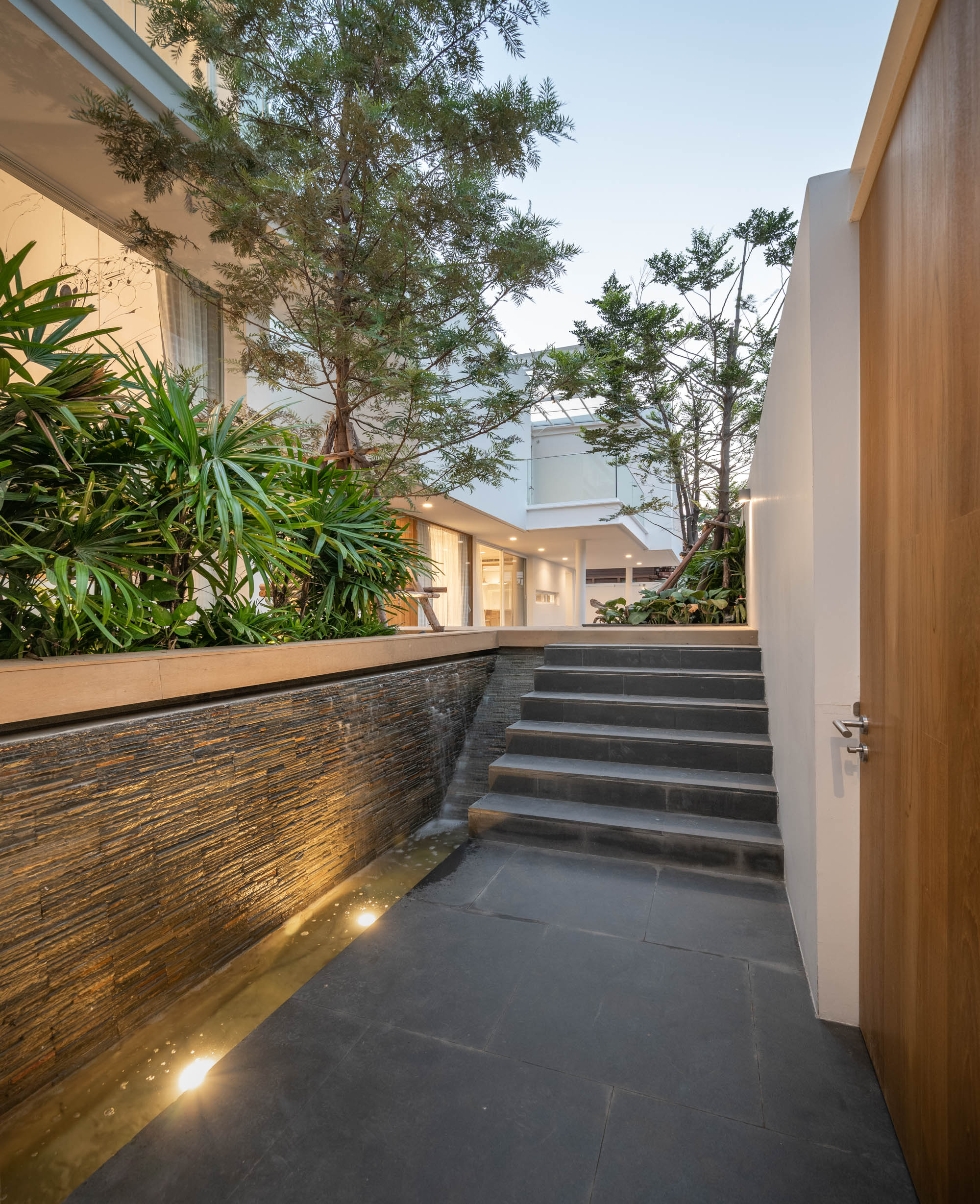 พื้นที่ระเบียงไม้หน้าบ้านที่สอดแทรกสวนและน้ำตกเล็กๆเพื่อเพิ่มบรรยากาศดีๆให้กับตัวบ้าน ซึ่งแม้มีระดับที่แตกต่างกันเล็กน้อย แต่ด้วยวัสดุที่ใช้ก็ทำให้พื้นที่กลายเป็นหนึ่งเดียวกัน