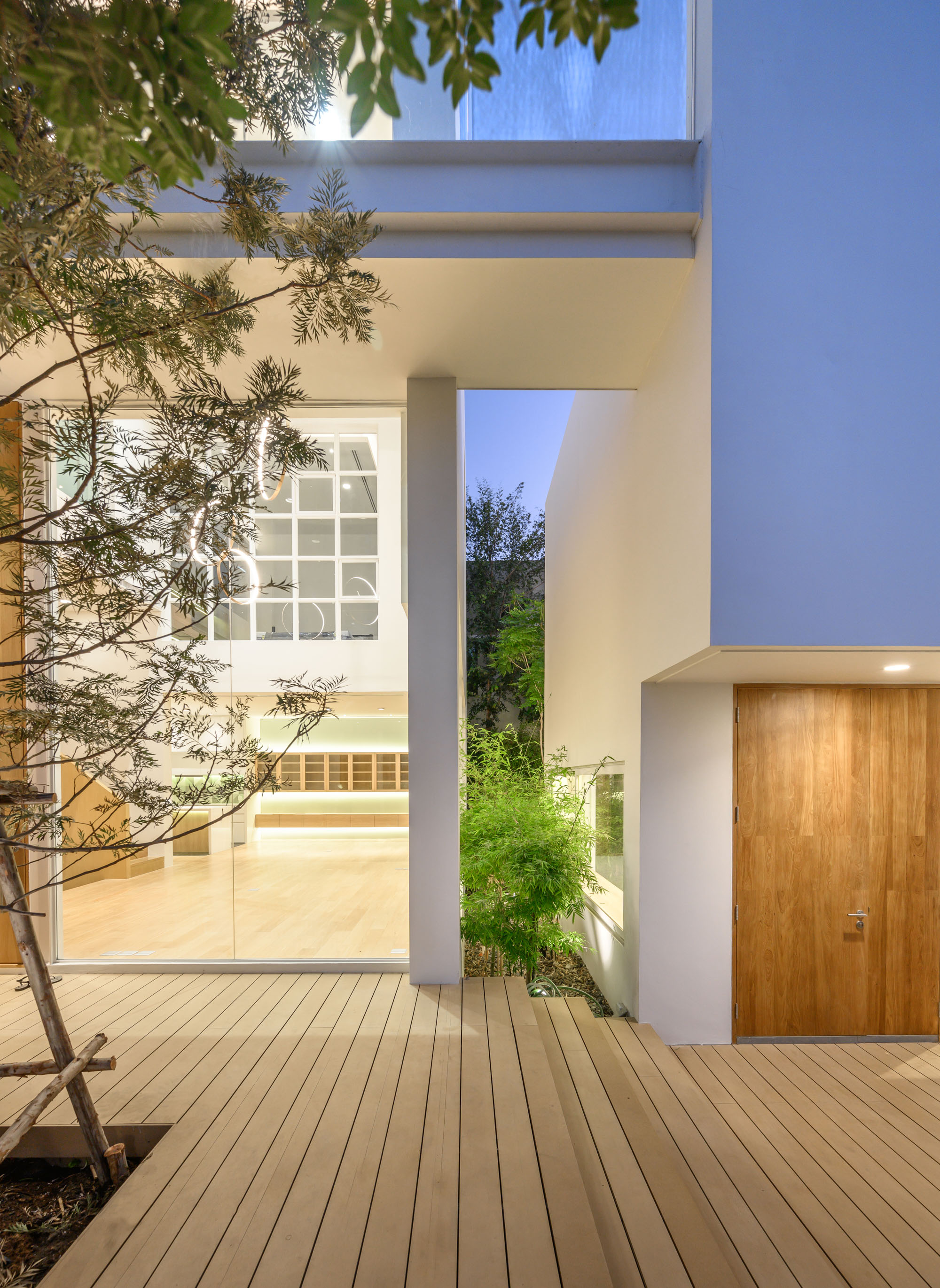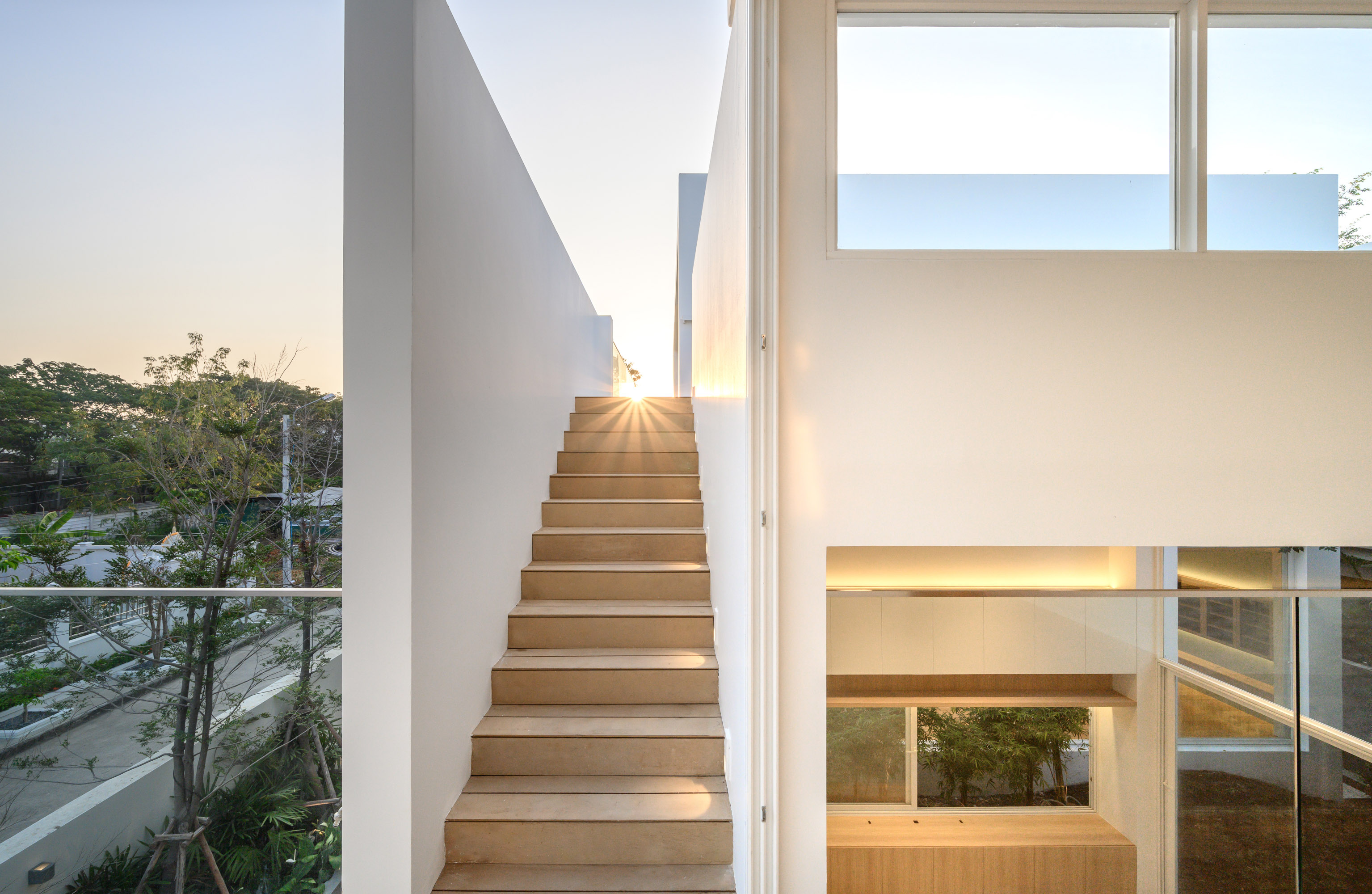 “ถ้ามองจากภายนอกจะมีเพียงแมททีเรียลสีขาว กระจก เพราะเราพยายามออกแบบให้บ้านดูคลีนที่สุด หมายความว่า ช่องเปิด จะเปิดเมื่อต้องการเชื่อมต่อผู้อยู่อาศัย แสง และต้นไม้เท่านั้น” สถาปนิกกล่าว นั่นคือเหตุผลว่าทำไมเราจึงเห็นบ้านทั้งสองหลังเส้นสายเฉียบคมตรงไปตรงมา หน้าต่างเป็นกระจกเปิดกว้างตั้งแต่พื้นจรดฝ้า และเชื่อมต่อมุมมองออกไปสู่พื้นที่ธรรมชาติ อย่างคอร์ทยาดที่ถูกออกแบบไว้ทั้งหน้าบ้าน กลางบ้าน และหลังบ้าน เติมเต็มบรรยากาศร่มรื่นภายในบ้านและทำให้บ้านดูชีวิตชีวามากยิ่งขึ้น