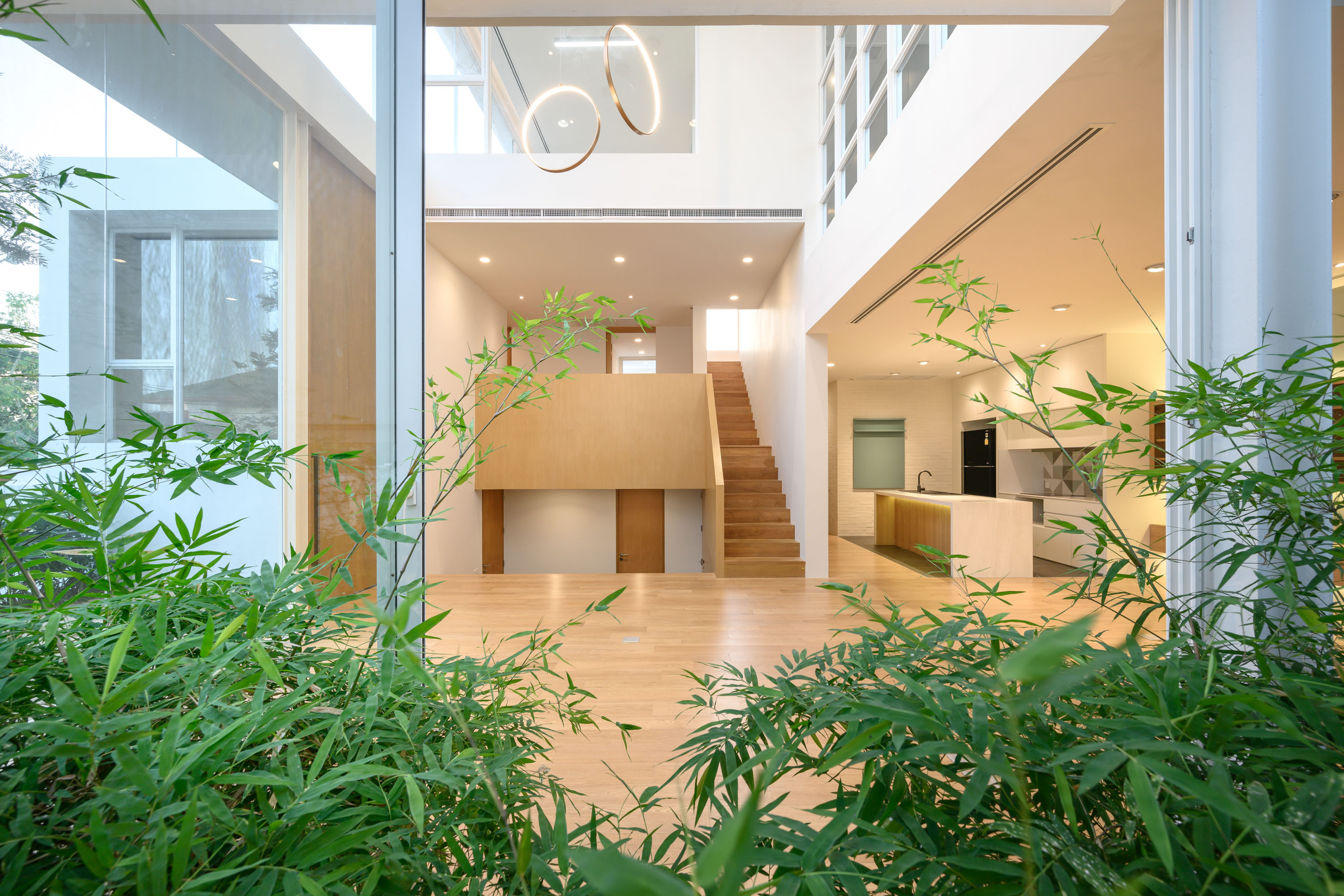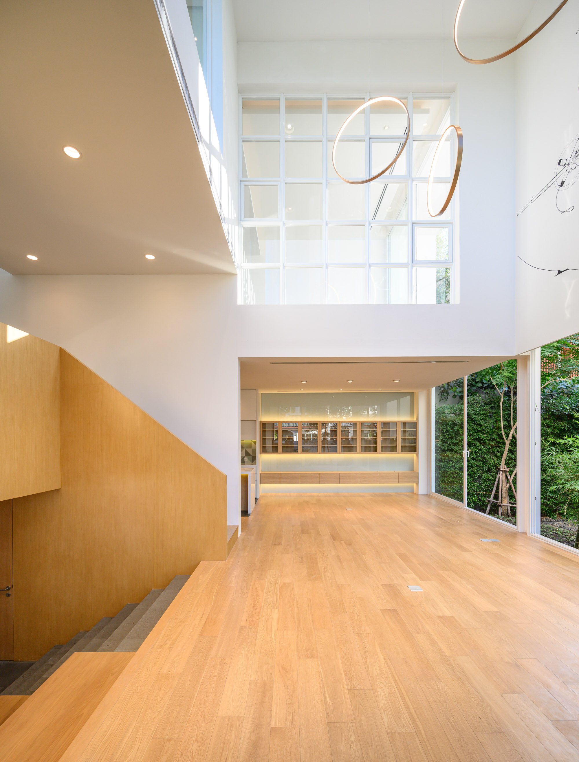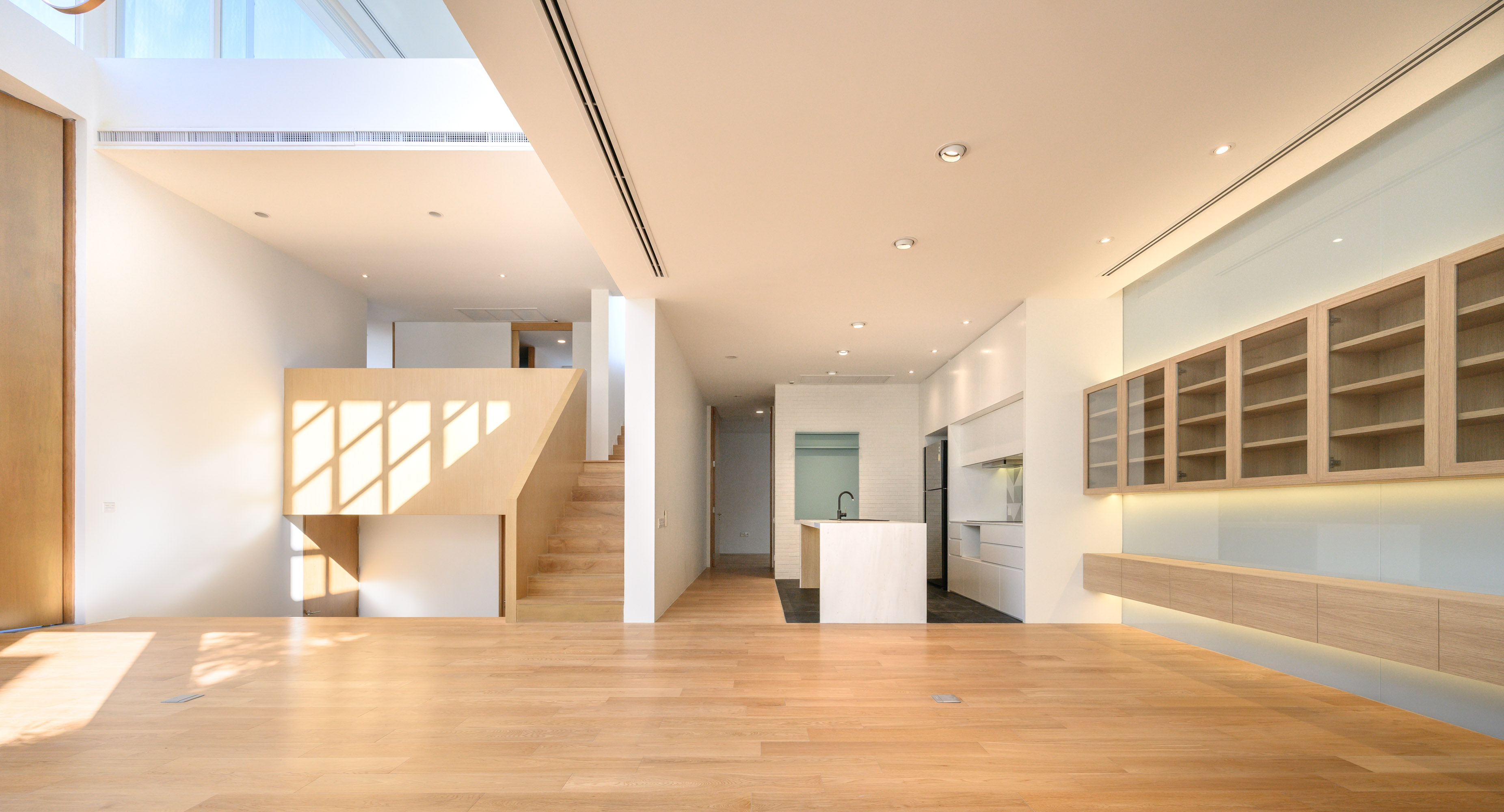 ห้องรับแขกหลักถูกยกตัวสูงขึ้นมากกว่าบ้านอีกหลังเล็กน้อยเพื่อสร้างความเป็นส่วนตัว และออกแบบพื้นที่ให้เป็น Double Volumn ในลักษณะโถงสูงที่เชื่อมต่อไปยังส่วนรับประทานอาหารและห้องครัวในด้านหลังแบบเปิดโล่ง ทำให้บ้านดูโปร่งและน่าอยู่มากยิ่งขึ้น บันไดที่เกิดขึ้นจากการยกระดับภายในบ้านถูกออกแบบให้เป็นชั้นวางรองเท้าไปในตัว ถัดขึ้นไปชั้นลอยเป็นส่วนของห้องทำงานและห้องนอน ส่วนชั้นบนสุดเป็นห้องMultipurpose