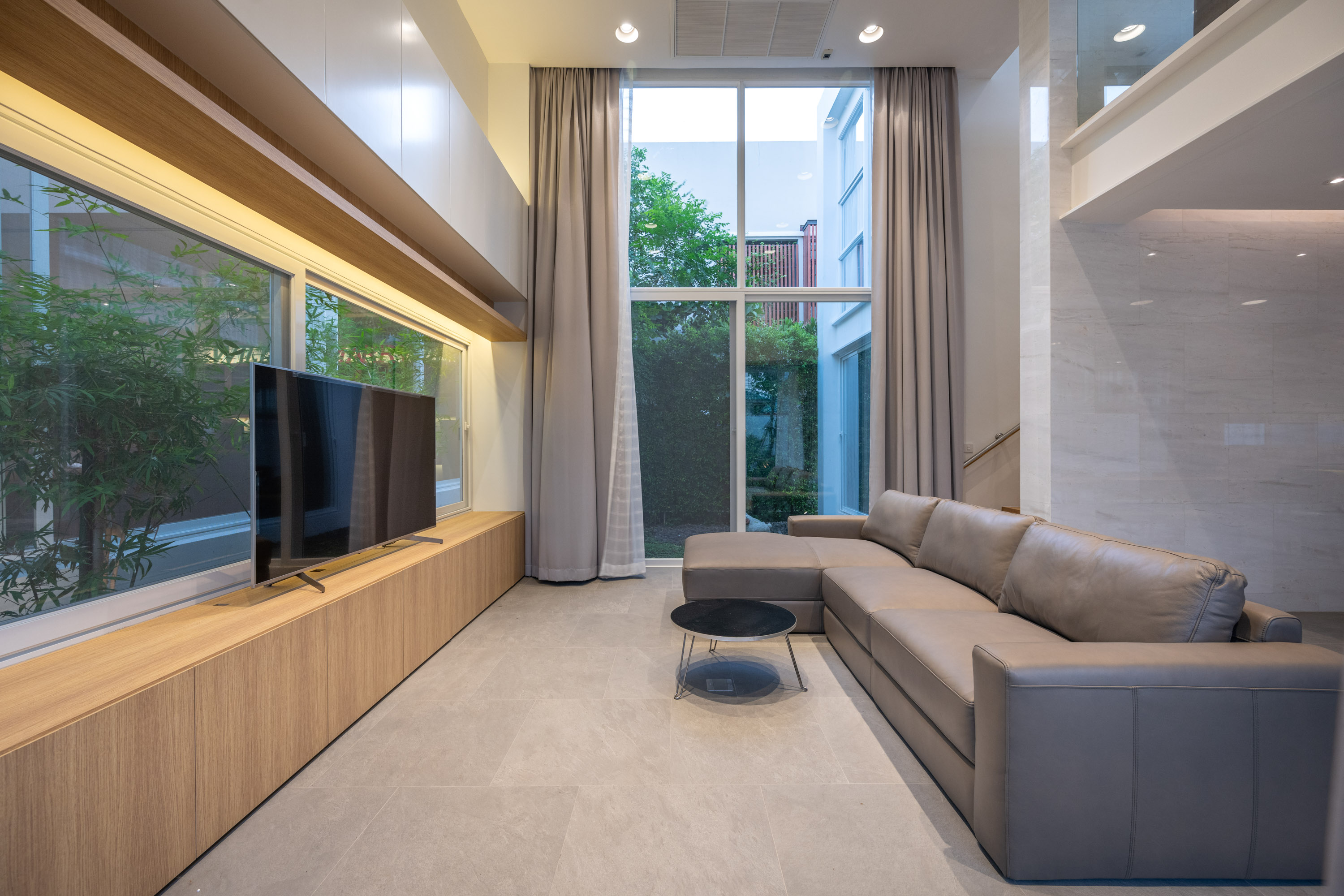 อีกหนึ่งจุดเชื่อมต่อสำคัญที่ผสานบ้านสองหลังให้กลายเป็นหนึ่งเดียวคือ บางมุมมองทุกคน ‘สามารถมองเห็นความเคลื่อนไหวซึ่งกันและกันได้’ เช่น ภายในห้องรับแขก ของทั้งสองบ้านที่เปิดมุมมองเข้าหากันและกัน แม้จะมีระดับความสูงห้องต่างกันและมีคอร์ทต้นไผ่กั้น เพื่อสร้างความเป็นส่วนตัว แต่หากยืนขึ้นแล้วมองไปยังบ้านอีกหลัง จะพบว่าสามารถมองเห็นกันและกันได้ ซึ่งทำให้การอยู่อาศัยเป็นไปอย่างพอดิบพอดีและเกิดปฏิสัมพันธ์ที่อบอุ่นระหว่างครอบครัวในขณะเดียวกัน