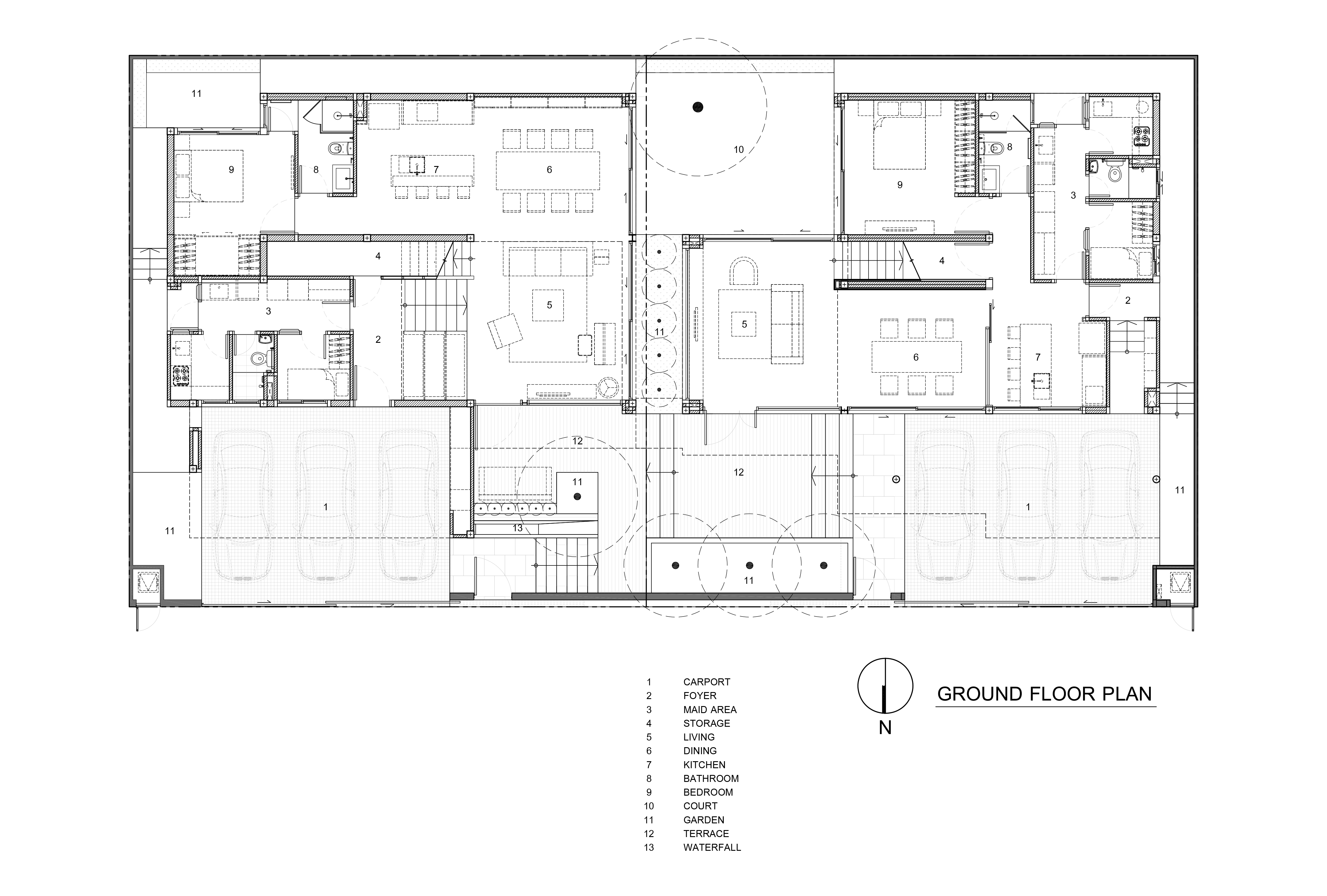 แม้รูปแบบการใช้ชีวิตจะต่างกัน แต่บ้านทั้งสองก็มี ‘ความลื่นไหลของพื้นที่’ จากจุดหนึ่งไปยังบ้านอีกหลังหนึ่งเสมอ เช่น บ้านทั้งสองมีทางเข้าสู่ตัวบ้านสองทางด้วยกัน หนึ่งคือจากโรงจอดรถ และสองจากระเบียงหน้าบ้านกว้างที่เชื่อมถึงกันและกัน ซึ่งเป็นพื้นที่ที่ถูกออกแบบไว้เพื่อให้สมาชิกของทั้งสองบ้านไปมาหาสู่กันได้อย่างสะดวกสบาย รวมถึงดาดฟ้าชั้นบนสุดที่เชื่อมต่อออกมาจากห้องmulti-purpose ของบ้านทั้งสองหลัง นอกจากจะเป็นพื้นที่กิจกรรมของครอบครัวแล้ว ยังสามารถใช้พื้นที่เหล่านี้เพื่อต้อนรับเพื่อนที่มาเยี่ยมเยียนได้อีกด้วย